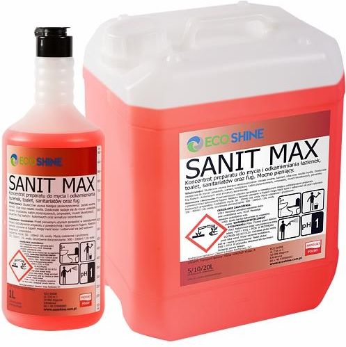 SANIT MAX Koncentrat pianowego preparatu do mycia i odkamieniania łazienek, kabin prysznicowych, toalet, sanitariatów. Właściwości: Skutecznie usuwa bieżące zanieczyszczenia: zacieki wodne, kamień, rdzę oraz resztki mydła. Doskonale nadaje się do mycia: posadzek, wanien, brodzików, kabin …