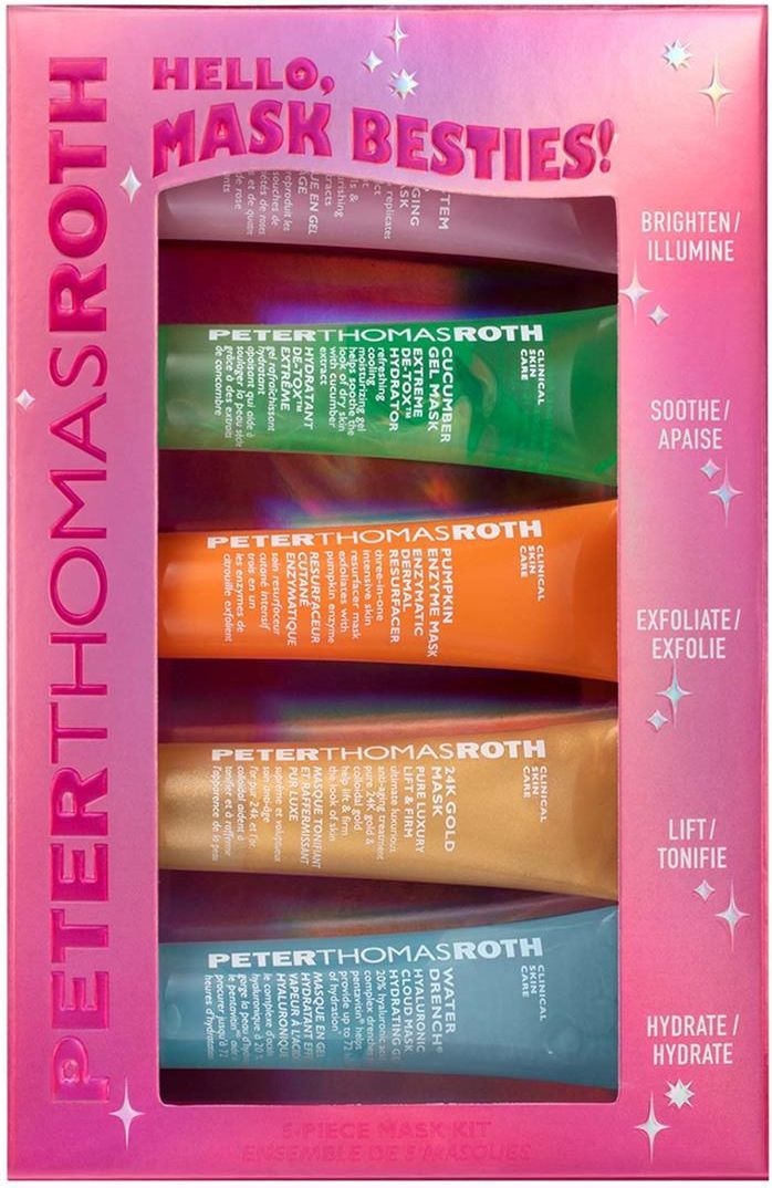 Featuring five powerful formulas that target your skin’s ever-changing needs, the Peter Thomas Roth Hello, Mini Masks Set offers a spa-like treatment with every application. Set Contents: Pumpkin Enzyme Mask 14ml This 3-in-1 formula exfoliates, peels and polishes the skin. Powered by a blend of aluminium oxide crystals and pumpkin enzymes, the mask buffs away dead surface cells to promote a smooth, brighter-looking complexion. Water Drench Hyaluronic Cloud Mask 14ml A skin-quenching treatment enriched with a 20% hyaluronic acid complex, designed to deliver up to 72 hours of hydration. The formula envelops the skin in moisture, helping to minimise feelings of dryness and visibly plump. 24K Gold Mask 14ml With pure 24 karat gold and gemstone peridot at the heart of its formula, this luxurious mask encourages a radiant appearance. Perfect for mature skin types, the treatment minimises the look of fine lines, while delivering a firming effect. Rose Stem Cell Mask 14ml Experience touchably soft skin with this nourishing mask. The rose-scented formula utilises plant biotechnology to add visible luminosity and elasticity to the complexion, its cooling jelly texture instantly refreshing the skin. Cucumber Gel Mask 14ml The Peter Thomas Roth Cucumber Gel Mask provides a sense of comfort to skin after waxes, peels and electrolysis treatments. Gentle and lightweight, the botanical-rich mask leaves skin feeling soothed.