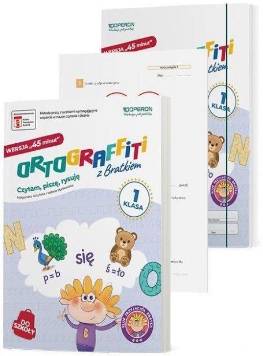 Seria Ortograffiti z Bratkiem występuje w dwóch wersjach: wersji 90 minut i wersji 45 minut. Wersja 90 minut (dotychczasowa) jest przeznaczona dla tych nauczycieli, którzy mają 2 godziny lekcyjne zajęć tygodniowo, zaś wersja 45 minut dla tych, którzy mają 1 godzinę lekcyjną zajęć tygodniowo.Ortograffiti z Bratkiem. Wersja 45. Klasa 1. ZestawW zestawie: Zeszyt ćwiczeń - jeden na cały rok szkolny: Ortograffiti z Bratkiem. Wersja 45 minut. Klasa 1 Karty pracy - 28 kart pracy, w tym karty postępów i karty pracy domowej. W ramach podsumowania prowadzący wypełnia z uczniami kartę postępów na koniec każdego bloku. Karty pracy domowej pozwalają dzieciom utrwalić wiadomości z danych zajęć. Dodatkowo w zestawie są karty z pomocami dydaktycznymi do samodzielnego wykonania: zjadacz liter, okienko do czytania. A także: dyplom, gra memo do wycięcia, planszówka, inne. Teczka do przechowywania materiałów i kart pracy. Ortograffiti z Bratkiem. Wersja 45 minut. Zestaw dla uczniów "Ortograffiti z Bratkiem" to innowacyjny zestaw edukacyjny, który w przystępny sposób wprowadza uczniów w świat ortografii. Dzięki interaktywnym ćwiczeniom i zabawnym zadaniom, uczniowie będą mogli rozwijać swoje umiejętności pisania, a także utrwalać zasady ortograficzne w przyjemny sposób. Dla kogo jest ta książka? Uczniowie szkół podstawowych Nauczyciele języka polskiego Rodzice wspierający dzieci w nauce ortografii Pedagodzy i terapeuci zajęciowi Co zyskasz dzięki tej publikacji? Interaktywne ćwiczenia: Uczniowie będą mieli okazję do aktywnego uczestnictwa w nauce poprzez różnorodne zadania. Utrwalenie zasad ortograficznych: Zestaw pomoże w przyswojeniu i zapamiętaniu reguł ortograficznych. Rozwój umiejętności pisania: Ćwiczenia skoncentrowane na poprawnym pisaniu wspierają rozwój językowy uczniów. Przyjemna forma nauki: Dzięki zabawnym i angażującym zadaniom, nauka staje się przyjemnością. Kluczowe tematy i obszary Ortografia w języku polskim Interaktywne metody nauczania Rozwój umiejętności językowych Praca z dziećmi w wieku szkolnym O Autorach Małgorzata Rożyńska oraz Izabela Mańkowska to doświadczone autorki, które specjalizują się w tworzeniu materiałów edukacyjnych dla dzieci. Ich prace charakteryzują się innowacyjnym podejściem do nauczania oraz dbałością o rozwój umiejętności językowych najmłodszych. O Wydawcy Operon – renomowane wydawnictwo edukacyjne, które od lat dostarcza wysokiej jakości materiały dydaktyczne, wspierające nauczycieli i uczniów w procesie nauczania. Producent/osoba odpowiedzialna za bezpieczeństwo produktu Wydawnictwo Pedagogiczne Operon Sp. z o.o. Aleja Zwycięstwa 96/9881-451 Gdyniainfo@operon.pl586790000