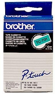 Brother TC-701. Czarny nadruk na zielonym tle, szerokość 12mm Opracowana z myślą o odporności na ekstremalne temperatury i czynniki środowiskowe, wszechstronna taśma TC-701 pozwala na druk trwałych etykiet. Zielone etykiety z czarnym nadrukiem mogą być wykorzystywane zarówno w domu, biurze jak i innych miejscach pracy.  Główne cechy 12mm szerokości, 7,7m długości Standardowa przyczepność Wysokiej jakości, oryginalna taśma firmy Brother Zapewnia wyraźne i trwałe rezultaty TC-701 sprawdzi się idealnie w druku ogólnych etykiet na potrzeby biurowe i domowe. Taśma Brother z czarnym nadrukiem na zielonym tle o szerokości 12mm pozwala między innymi na oznaczanie zawartości folderów z dokumentami, teczek archiwizacyjnych i szafek.   Laminowane etykiety Brother P-touch zostały opracowane z myślą o przetrwaniu nawet w najbardziej ekstremalnych warunkach. Etykiety są odporne na działanie temperatury, zdrapywanie, ścieranie, zmywanie, promieniowanie UV czy substancje chemiczne.