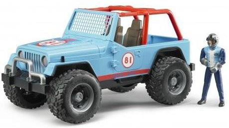 Bruder 02541 Jeep Cross Country Racer niebieski z figurką rajdowca Doskonała zabawka edukacyjna, której głównymi cechami są: składana szyba otwierana maska skrętna przednia oś przedłużona kierownica ułatwiająca kierowanie pojazdem. w zestawie z kierowcą rajdowym Posiada typowe dla zabawek Brudera …