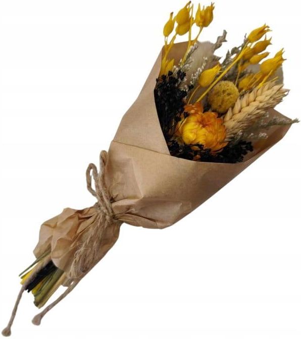 Bukiet Suszonych Kwiatów „Słońce i Cień” W tym małym bukiecie spotykają się dwa żywioły: światło i cień, ciepło i spokój. Żółte kocanki niczym promienie słońca, a obok nich ciemne, eleganckie akcenty suszonych roślin – to kontrast, który tworzy harmonię. Mały, ale z charakterem. Zaskakujący, odważny i jednocześnie delikatny. Wyhodowany i ususzony w Polsce – z troską i w zgodzie z naturą Zawartość bukietu (rozpoznane gatunki) Kocanki ogrodowe (helichrysum) – papierowe, intensywnie żółte Barwione suszone limonium (czarne) – dodaje głębi i kontrastu Craspedia (kulka billy button) – okrągły, dekoracyjny akcent Kłosy zbóż (pszenica) – naturalne, klasyczne tło Suszone kapsułki lnu barwione na żółto – ciekawa, smukła forma Gipsówka suszona lub ozdobna trawa – drobna, biała lekkość Wymiary: Wysokość: 24 cm Szerokość: 8 cm Część kwiatowa: ok. 17 cm