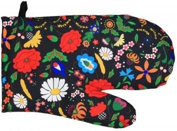 Rękawica kuchenna kociewska, czarna Niezbędna w każdej kuchni. Intensywny, folkowy wzór haftu kociewskiego uprzyjemni prace kuchenne. Projekt inspirowany tradycyjnymi ludowymi haftami kociewskimi. Rękawica wykonana z wysokogatunkowej tkaniny poliestrowej o gramaturze 160 g. Cena dotyczy jednej sztuki. Wymiary: szerokość 17 cmdługość 26 cm Wyprodukowano na Pomorzu.