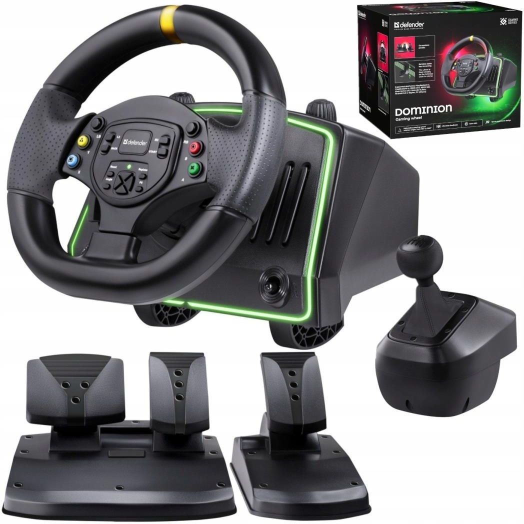 Kierownica Defender DOMINION z pedałami i drążkiem zmiany biegów Kompatybilna z PC, PS 5, Xbox S/X, Nintendo Switch i Android. Sportowy design, efekt wibracji, regulator czułości, mocne mocowanie do biurka i szeroki kąt obrotu 1080°. Idealna do gier wyścigowych i symulatorów. PEŁNY OBRÓT KIEROWNICY …