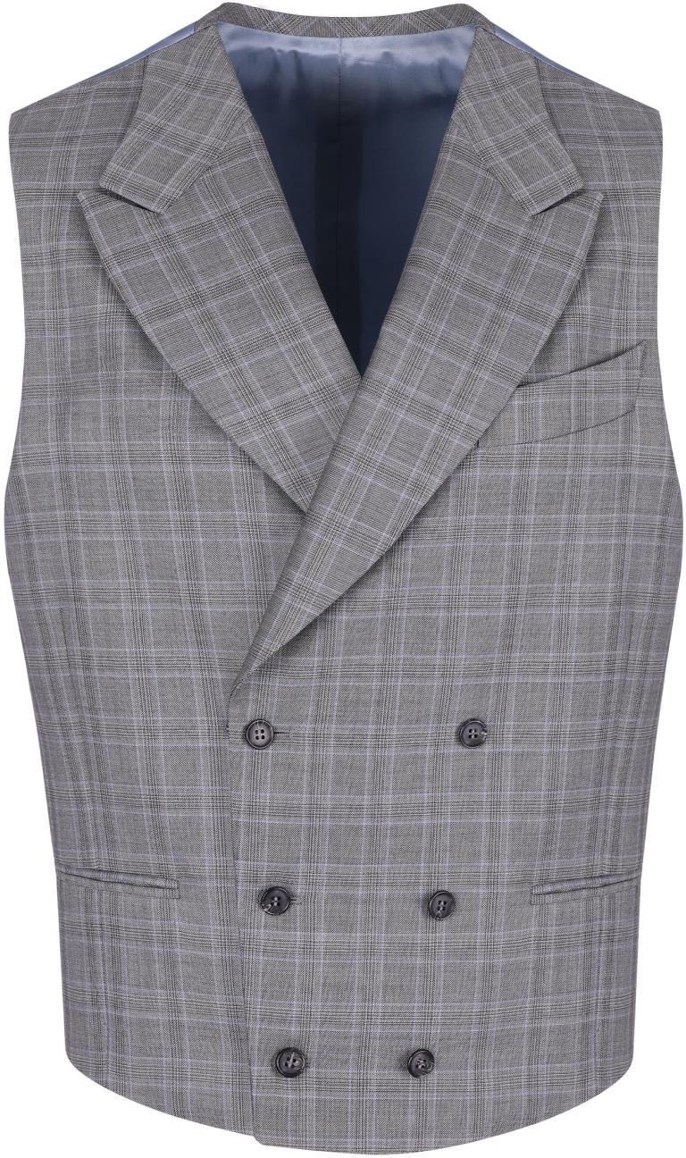 Dwurzędowa kamizelka York Dwurzędowa kamizelka szara w subtelną błękitną kratę to świetne uzupełnienie stylizacji opartej na klasycznym, granatowym lub grafitowym garniturze. Elegancka kamizelka męska wykonana została z tkaniny od włoskiej tkalni Guabello z wełny 120's i gramaturze 275g/m. …