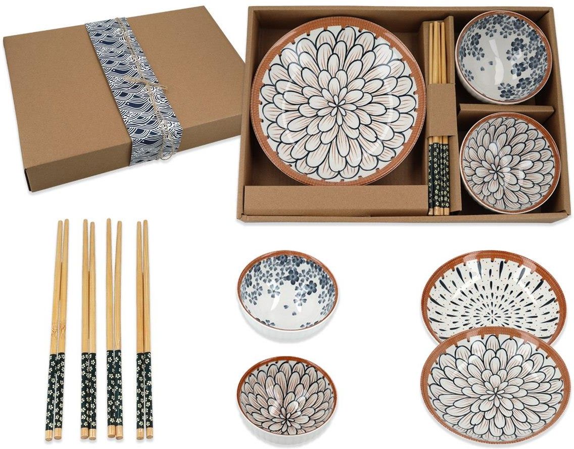 Zorganizuj wieczór w klimacie kultury orientalnej – zapal kadzidełka i podaj swoim gościom sushi na specjalnym porcelanowym zestawie w stylu japońskim. Porcelanowy zestaw do sushi składający się z 5 elementów. Naczynia o kremowym odcieniu bieli zdobione są orientalnym wzorem oraz delikatnym tłoczeniem po zewnętrznej stronie. Zestaw dla 2 osób, który zawiera 2 komplety pałeczek, talerz oraz 2 miseczki o pojemności całkowitej około 260 ml (pojemność liczona po rant miseczki). Komplet wygodny w użytkowaniu i prosty w utrzymaniu czystości. Można go swobodnie myć w zmywarce oraz używać w kuchence mikrofalowej, co ułatwi codzienne użytkowanie i zaoszczędzi nasz cenny czas. Całość zapakowana w ozdobne pudełko to doskonały pomysł na niebanalny prezent urodzinowy dla miłośników dobrego japońskiego jedzenia i nie tylko. Wzór: 846-3212 Produkt 2 x zestaw pałeczek 2 x miseczka 1 x talerz 1 x ozdobne opakowanie Wymiary talerzyk: średnica: 20,3 cm, h 4 cm miseczka: średnica 11,3 cm, h 6 cm, poj. około 260 ml długość pałeczek: 22,5cm wymiary pudełka: 37,5cm x 25 cm x h6,5 cm Materiał porcelana Użytkowanie dopuszczone do kontaktu z żywnością do zmywarki do mikrofali
