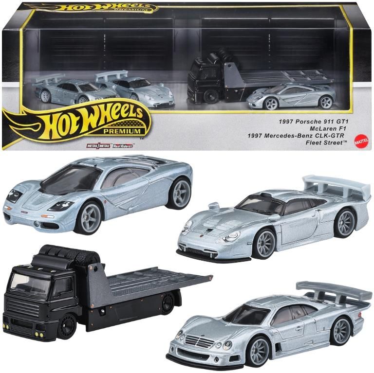 Hot Wheels® Premium Pojazdy dla kolekcjonerów, zestaw z 3 samochodzikami Hot Wheels® w skali 1:64 i 1 pojazdem Team Transport w skali 1:64, metalowa konstrukcja i opony Real Riders™. Zestawy Hot Wheels® Premium z pojazdami dla kolekcjonerów zawierają 4 pojazdy Hot Wheels® w opakowaniu z okienkiem, …