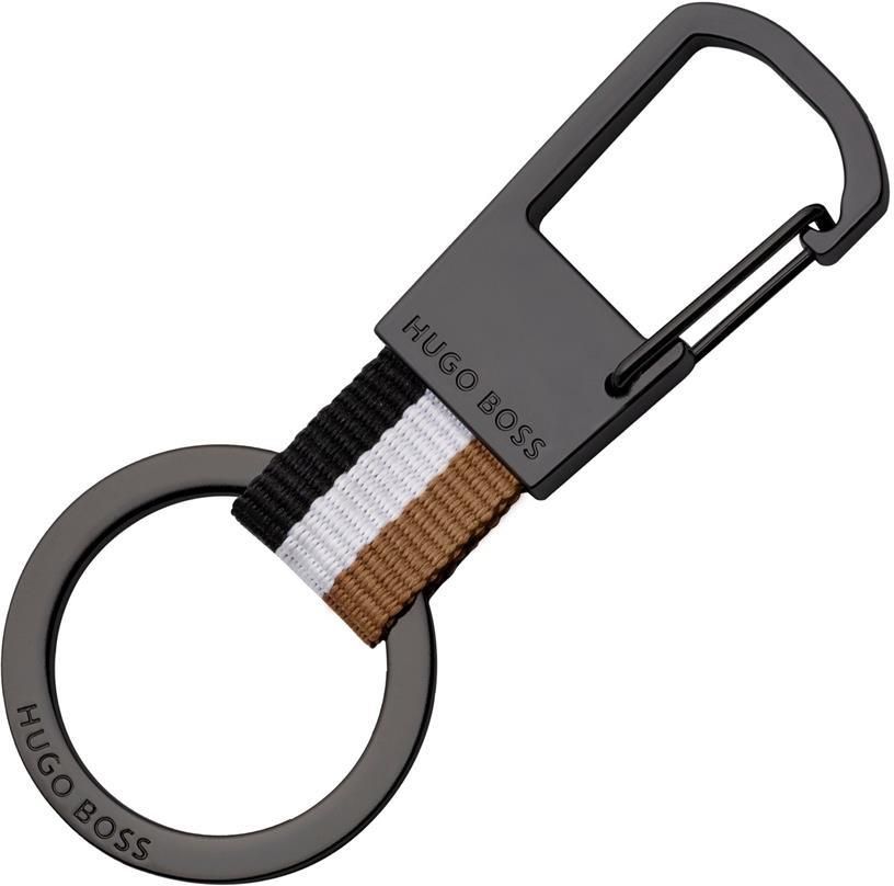Ten brelok został zaprojektowany, aby uczcić nową markę HUGO BOSS oraz ich graficzne i nowoczesne ikoniczne 3 kolorowe paski. Podpisany trójkolorowy pasek jest wzmocniony luksusowymi chromowanymi akcentami metalowymi, przekształcając codzienne podstawowe rzeczy w nowoczesne i niedopowiedziane akcesoria.