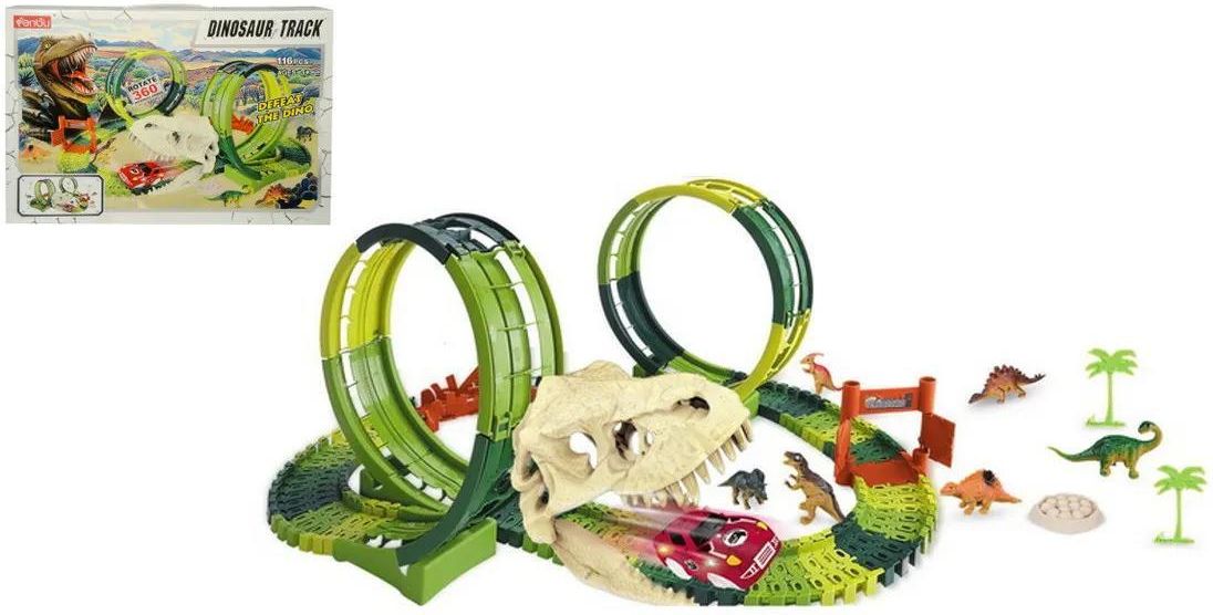 Tor to nie tylko zabawka, ale także wyzwania, które pobudzają wyobraźnię i kreatywne myślenie. Budowanie i projektowanie toru wyścigowego to proces, który wymaga cierpliwości dziecka i wytrwałości. Tor z motywem dinozaura. Zestaw zawiera 116 elementów. Autko świeci kolorowymi światełkami. W zestawie także figurki dinozaurów i palm. Wybrane elementy zestawu działają na baterie typu AAA. Baterie nie są załączone do zabawki. Zabawka zapakowana w kartonowe opakowania. Wymiary są wymiarami opakowani