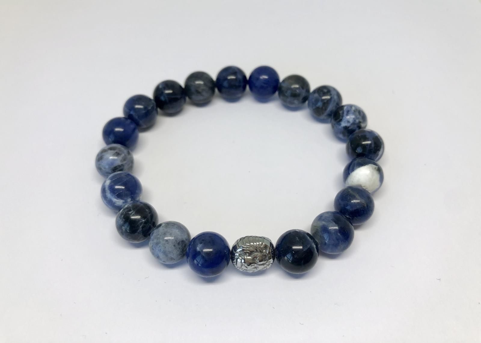 Kolekcja: For men Materiał: Sodalit (kamień półszlachetny), gumka Dodatki: Hematyt Średnica kulek: 10 mm Dostępne rozmiary: XS (17 cm), S (18 cm), M (19 cm), L (20 cm), XL (21 cm) Bransoletka jest wykonana z kamieni półszlachetnych oraz hematytu, założonych na gumkę. Jest łatwa do założenia i zdejmowania. Pasuje do strojów eleganckich oraz sportowych. Świetnie się nadaje na prezent.