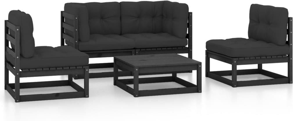 Ten ogrodowy zestaw wypoczynkowy jest znakomitym wyborem na relaks i korzystanie z pogody, a także drzemkę czy rozmowę z rodziną lub przyjaciółmi. Zestaw mebli wypoczynkowych do ogrodu wykonano z litego drewna sosnowego, dzięki czemu jest solidny i stabilny. Poduszki zapewniają większy komfort. Możesz zestawić komplet z innymi segmentami modułowymi, aby stworzyć własne konfiguracje ogrodowych zestawów wypoczynkowych! Uwaga: aby przedłużyć żywotność mebli ogrodowych, zalecamy ich regularne czyszczenie i niepozostawianie na zewnątrz bez właściwego zabezpieczenia. Czyszczenie: użyj roztworu wody z delikatnym detergentem Przechowywanie: jeżeli jest to możliwe, przechowuj produkt w chłodnym i suchym miejscu, najlepiej w pomieszczeniu. Jeśli ma on być przechowywany na zewnątrz, należy go zabezpieczyć wodoszczelnym pokrowcem. Po deszczu lub śniegu usuń nadmiar wody lub śniegu z płaskich powierzchni i osusz je. Zapewnij wystarczającą cyrkulację powietrza, aby uniknąć uszkodzeń spowodowanych przez wilgoć. Kolor: czarny Kolor poduszki: antracytowy Materiał: lite drewno sosnowe, tkanina (100% poliester) Wymiary sofy środkowej/narożnej: 70 x 70 x 67 cm (szer. x gł. x wys.) Wymiary stolika: 70 x 70 x 30 cm (szer. x gł. x wys.) Wymiary poduszki na siedzisko: 58 x 58 x 10 cm (dł. x szer. x gr.) Wymiary poduszki na oparcie/bok: 50 x 40 x 12 cm (dł. x szer. x gr.) Wymagany montaż: tak Zawartość przesyłki: 2 x sofa narożna 2 x sofa środkowa 1 x stół 4 x poduszka na siedzisko 6 x poduszka na oparcie/bok