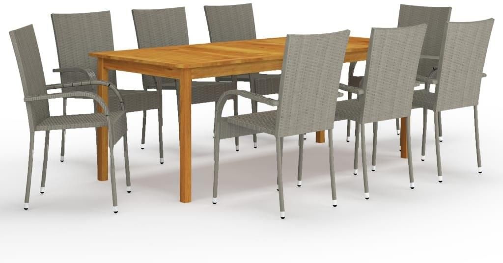 Stwórz fascynującą i spójną estetykę w swojej przestrzeni na świeżym powietrzu dzięki naszemu zestawowi jadalnianemu do ogrodu! Stół jadalniany wykonano z litego drewna akacjowego, wykończonego olejem, dzięki czemu jest stabilny, trwały i łatwy w utrzymaniu. Zawierające malowane proszkowo, stalowe ramy pokryte odpornym na czynniki pogodowe rattanem PE krzesła stołowe są mocne i łatwe do czyszczenia. Krzesła te są lekkie i można je złożyć w stos, aby zaoszczędzić miejsce, gdy nie są używane. Uwaga: zalecamy przykrycie mebli na czas opadów deszczu, śniegu lub mrozu, aby mogły posłużyć dłużej. Stół: Materiał: lite drewno akacjowe, wykończone olejem Wymiary: 200 x 90 x 74 cm (dł. x szer. x wys.) Krzesło: Kolor: szary Materiał: rattan PE (polietylenowy), malowana proszkowo stal Wymiary: 55,5 x 53,5 x 95 cm (szer. x gł. x wys.) Szerokość siedziska: 34 cm Głębokość siedziska: 43 cm Wysokość siedziska nad ziemią: 44 cm Wysokość podłokietników nad ziemią: 64 cm Wymagany montaż: tak Zawartość przesyłki: 1 x stół 8 x krzesło