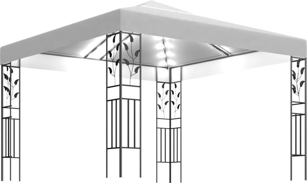 Zapewnij sobie cień i prywatność dzięki tej altanie, aby Twoja przestrzeń na świeżym powietrzu stała się jeszcze przyjemniejsza! Tę altanę wykonano z mocnej stali z trwałą i odporną na rdzewienie powłoką proszkową, dzięki czemu posłuży przez lata. Wentylowane zadaszenie powstrzyma słońce i deszcz przed zepsuciem zabawy podczas spotkania rodzinnego, grilla, pikniku popołudniowego lub imprezy urodzinowej. Zadaszenie wykonano z dobrej jakości tkaniny z powłoką PA, która zablokuje większość szkodliwych promieni. Ma ono wzmocnione narożniki i mocowania na rzep, które umożliwiają łatwe przymocowanie zadaszenia do ramy altany. Ponadto sznur lampek stworzy przytulną atmosferę w ogrodzie po zachodzie słońca. Lampki nie powodują zanieczyszczenia środowiska, gdyż są zasilane solarnie w ciągu dnia. UWAGA: tego produktu NIE WOLNO używać podczas złej pogody, takiej jak silny wiatr, intensywne opady deszczu lub śniegu, burza, itp. Kolor altany: biały Kolor światła: ciepły biały Materiał: malowana proszkowo stal, tkanina (100% poliester) z powłoką PA Wymiary: 3 x 3 x 2,5 m (dł. x szer. x wys.) Gramatura tkaniny: 180 g/m² Konstrukcja z podwójnym daszkiem zapewnia dobrą cyrkulację powietrza Rama z kwiatowym ornamentem Długość każdego sznura: 6 m Liczba LED: 43 Odległość między diodami LED: 0,25 m Odległość pomiędzy złączem a pierwszą diodą LED: 1 m Źródło zasilania: energia słoneczna Wymagany montaż: tak