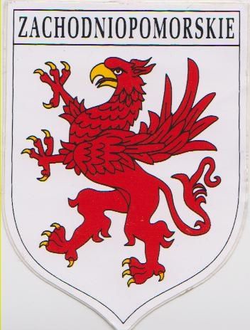 Naklejka z herbem województwa zachodniopomorskiego Herb województwa zachodniopomorskiego przedstawia w białym polu hiszpańskiej tarczy herbowej czerwonego, wspiętego w pozycji bojowej gryfa pomorskiego ze złotym dziobem, złotymi pazurami, z wywiniętym ogonem i zwróconego w prawą stronę …