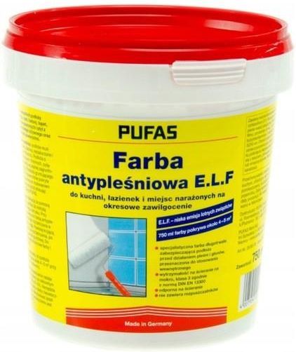 FARBA ANTYPLEŚNIOWA PLEŚŃ GLONY PUFAS 5L BIAŁA FARBA ANTYPLEŚNIOWA PLEŚŃ GLONY PUFAS 5L BIAŁA Farba chroniąca powierzchnie przed pleśnią i glonami, idealna do pomieszczeń o podwyższonej wilgotności, takich jak kuchnie i łazienki. Właściwości Trwała ochrona przed wilgocią i rozwojem mikroorganizmów. Zastosowanie wewnętrzne – przeznaczona do malowania ścian i sufitów w środowiskach narażonych na okresowe zawilgocenie. Odporność na ścieranie: klasa 3 według normy DIN EN 13300. Bez rozpuszczalników i o niskiej emisji lotnych związków organicznych (technologia ELF). Nadaje się do różnych powierzchni, takich jak tynk, beton, tapety, płyty styropianowe i inne podłoża mineralne. Zalety Wysoka siła krycia i trwała ochrona powierzchni. Odporna na szorowanie i czyszczenie na mokro. Ekologiczna formuła – niski poziom emisji szkodliwych substancji. Łatwa aplikacja: można nanosić wałkiem, pędzlem lub pistoletem natryskowym. Parametry techniczne Kolor: biały. Pojemność opakowania: 5 litrów. Wydajność: 1 litr pokrywa około 6 m² powierzchni. Metody aplikacji: pędzel, wałek, pistolet natryskowy.