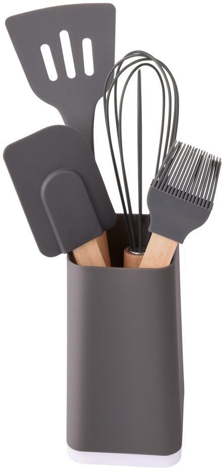 Zestaw kuchenny COOKING TOOLS, szary Stan: Nowy Kolory: Szary Waga (kg): 0.38kg Materiał: Plastik / Drewno / Silikon Wymiary (cm): 8 x 8 x 32 Zestaw kuchenny COOKING TOOLS. 5-częściowy zestaw silikonowych przyborów kuchennych z drewnianymi uchwytami: łopatka, skrobak do ciasta, pędzel, trzepaczka i pojemnik.