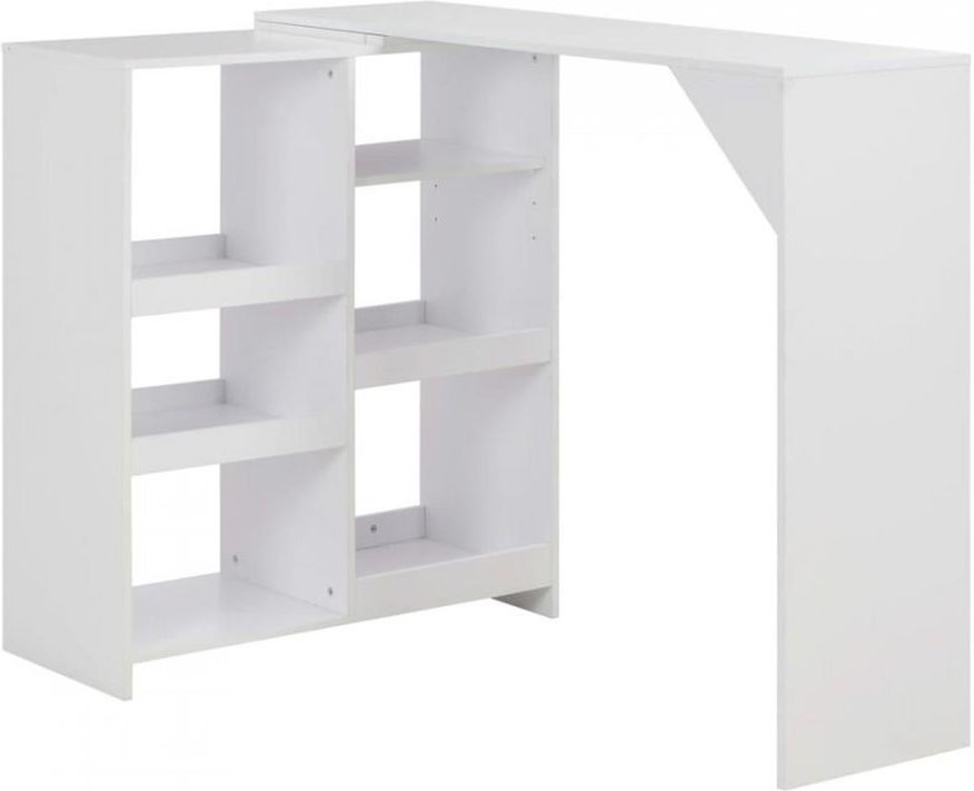 Stolik barowy z ruchomym regałem, biały, 138 x 39 x 110 cm vidaXL Kolor: Array Rozmiar: Array Nasz stolik jest idealnym wyborem do niewielkich pomieszczeń z uwagi na swój ruchomy regał. Współczesna forma czyni go szykownym dodatkiem do Twojej kuchni lub jadalni. Wykonany z trwałego materiału drewnopochodnego mebel jest wytrzymały, stabilny i łatwy w czyszczeniu. Rama w kształcie litery L i trójkątne wzmocnienie nadają stolikowi optymalną stabilność. Idealna wysokość i specjalna konstrukcja sprawiają, że ten stolik barowy upiększy wystrój Twojego domu. Usiądź wygodnie i ciesz się drinkiem lub posiłkiem razem z rodziną i przyjaciółmi! Montaż stolika barowego jest prosty. Kolor: biały Materiał: materiał drewnopochodny Wymiary całkowite: 138 x 39 x 110 cm (dł. x szer. x wys.) Wymiary regału: 90 x 39 x 107 cm (dł. x szer. x wys.) Regał jest ruchomy
