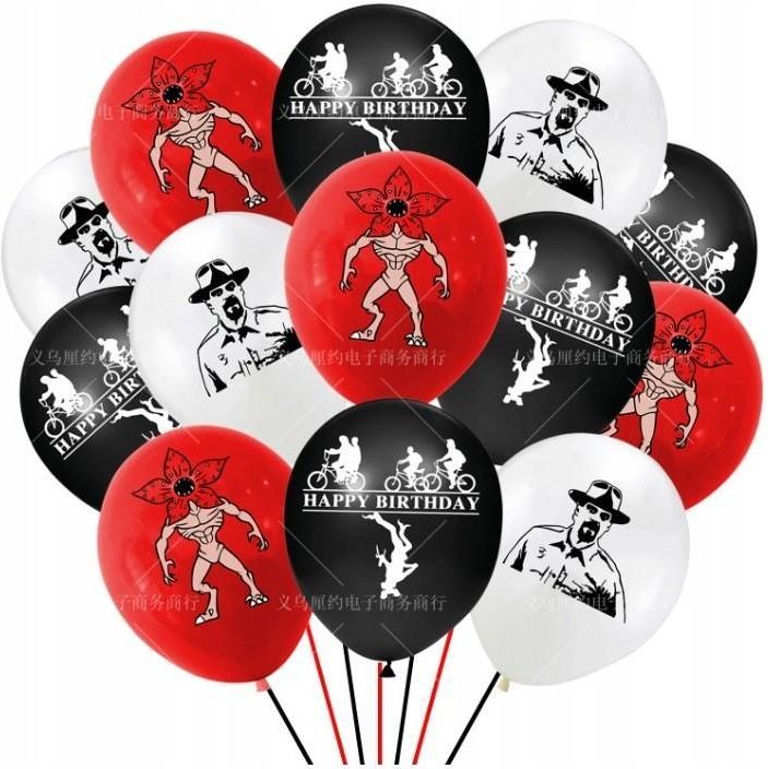 12 szt. Balon STRANGER THINGS ZESTAW BALONÓW STRANGER THINGS ⭐W skład zestawu wchodzi łącznie 12 balonów⭐ ✅4 szt balonów CZARNYCH Z NADRUKIEM HAPPY BIRTHDAY ✅4 szt balonów BIAŁYCH Z NADRUKIEM JIM HOPPER ✅4 szt balonów CZERWONYCH Z NADRUKIEM DEMOGORGON Balon z wizerunkiem postaci "Stranger Things" …
