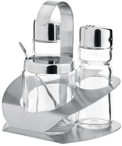 Zestaw do przypraw 3-elementowy zawierający: pojemniki na sól, pieprz i musztardę. W zestawie dodawana jest także wykonana ze stali nierdzewnej łyżeczka do musztardy.