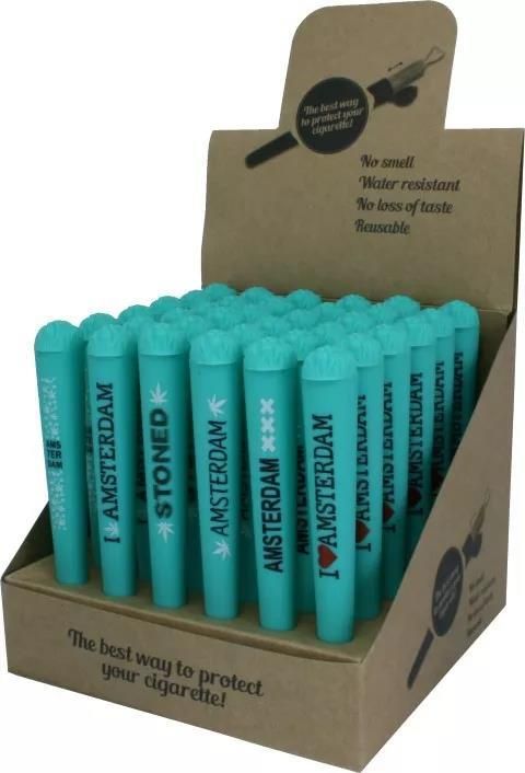 Joint Holder etui na jointa 6 wzorów Pojemnik do przechowywania jointa w kształcie stożka. Wykonany z plastiku w kolorze ciemnoniebieskim. Zapobiega przedostawaniu się zapachów. Pozwala na dłużej zachować świeżość jointa. Wodoodporny. Zamykany od góry. 6 napisów do wyboru: - od lewej napis …