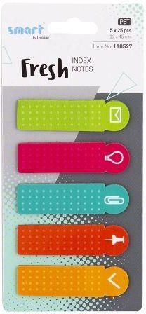 ZAKŁADKI INDEKSUJĄCE SMART PET FRESH 12x45mm 5x25sAbsolutnie świeże i wyjątkowe. Doskonałe wyróżnienie wskazanego tekstu. Zakładki są wykonane z folii PET, można je wielokrotnie przyklejać i odklejać, można po nich pisać. Każdy komplet to 5 wzorów po 25 zakładek o wymiarach 45x12 mm.Świeże i wyjątkowe zakładki indeksujące z inspirującymi oryginalnymi motywami. Te praktyczne zakładki przeznaczone są do zaznaczania ważnych miejsc w dokumentach, książkach, aktach, katalogach itp., do których chcemy jeszcze wrócić. Niezbędne w każdej pracy biurowej, ale także dla każdego ucznia i studenta. Wykonane z folii PET, można je wielokrotnie przyklejać i odklejać, nie niszcząc powierzchni. Każdy komplet to 5 wzorów po 25 zakładek o wymiarach 45x12 mm.