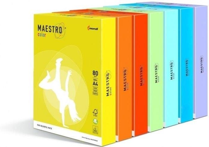 Papier kolorowy A4 80g 500 arkuszy MAESTRO kol. kremowy CR20Papier MAESTRO formatu A4, matowy, bezdrzewny, barwiony. Najwyższej jakości papier biurowy barwiony w masie celulozowej. Polecany do wydruków w drukarkach laserowych i atramentowych, a także w wysoko-nakładowych urządzeniach kopiujących. Zachowuje odporność barwy na starzenie. Posiada doskonałe właściwości podawania i może być zadrukowywany po obu stronach, co czyni go idealnym do kolorowego druku laserowego, druku atramentowego i kolorowych kopii. Równa powierzchnia i wysoka światłoodporność gwarantują najwyższą jakość. Gramatura 80g. Opakowanie 500 arkuszy. Kolor kremowy CR20