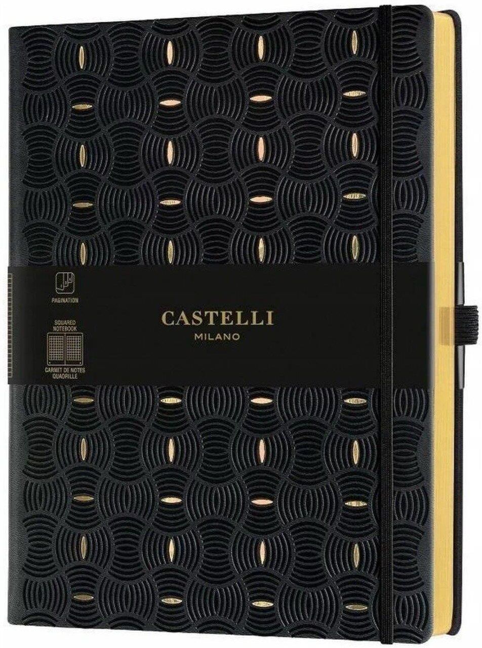 Notes CASTELLI RICE GOLD w kratkę elegancki notes z kolekcji Castelli charakteryzuje się perfekcyjnym wykonaniem, pełnym estetyki i stylu papier 80g/m3 w kolorze ivory z certyfikatem FSC kolorystycznie dopasowana zakładka kieszonka na dokumenty na tylnej wyklejce gumka zamykająca oraz uchwyt/gumka na długopis liniatura: w kratkę wymiar: 19 cm x 25 cm format: B5 ilość stron: 192 Produkt pochodzi z polskiej dystrybucji.