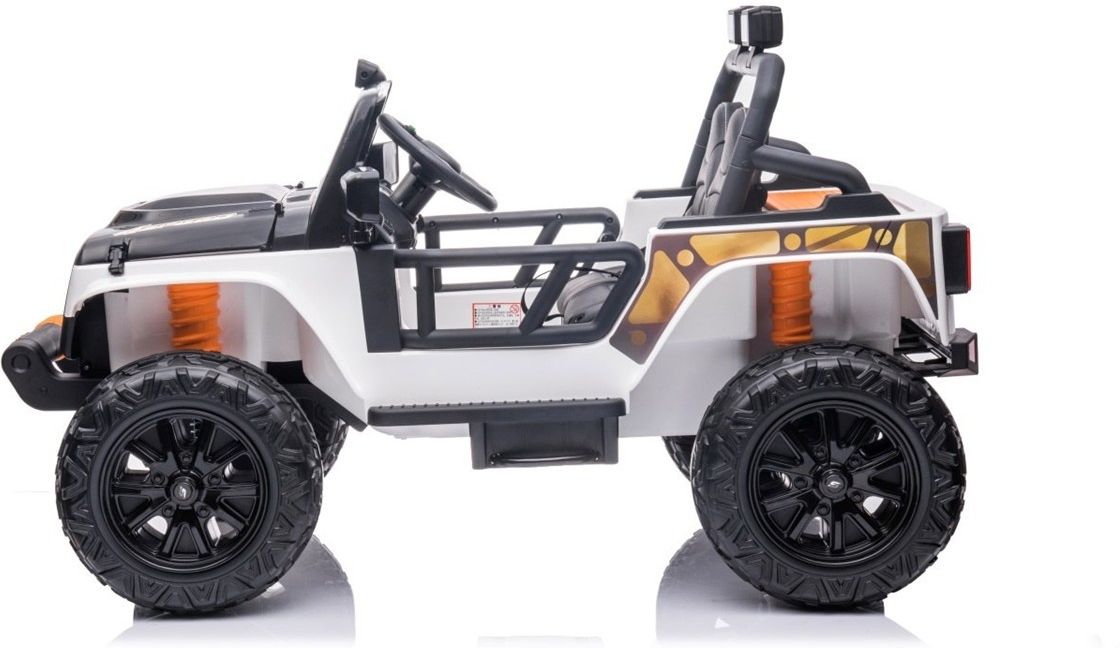 Specyfikacja Pojazd Jeep Monster Silnik 4x200W Akumulator 24V7Ah Pilot 2,4 GHz, 3 Szybkości, Przycisk bezpieczeństwa Stop, Koła Piankowe koła EVA, 30x12 cm, Amortyzatory Tył Biegi Wolny Start, Przód/Tył Światła Światła LED, Przednie, Światła z górnym pałąku zasilane na baterie, Wyposażenie Funkcja jazdy z rodzicem Przełącznik na desce rozdzielczej, Przycisk na kierownicy dla rodzica, Wysuwane podnóżki po bokach pojazdu, Wzmacniana skrzynia z tyłu pojazdu służąca jako siedzisko dla rodzica Panel Audio MP3, Bluetooth, Radio FM, Wejście USB, Przyciski dźwięków i klaksonu w kierownicy, Wgrane melodyjki, Wskaźnik Naładowania TAK Siedzenie Ekoskóra, Pasy bezpieczeństwa, 42x20x24 cm Bagażnik Tył : 34x10x11 cm Otwierane Drzwi Tak, Wymiary Rozmiar Pojazdu Długość 124 cm, Szerokość 65 cm, Wysokość 76 cm, Waga Pojazdu 26,2 kg Rozmiar Kartonu 114x60,5x38 cm Waga Kartonu 29,5 Kg Maksymalne Obciążenie 50 Kg Prześwit 21 cm Wyposażenie Dodatkowe Instrukcja + Zestaw Montażowy Ładowarka FUNKCJA JAZDY Z RODZICEM