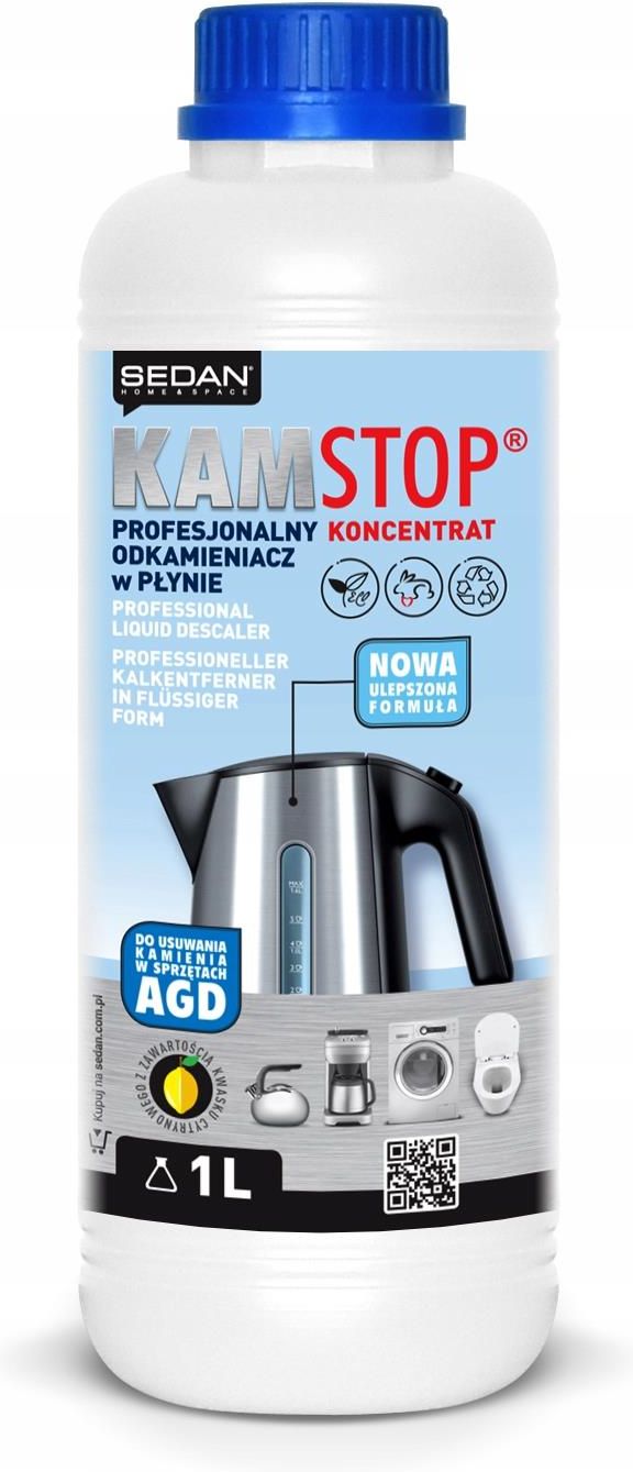 KAMSTOP Odkamieniacz w płynie 1l Regularne usuwanie kamienia w urządzeniu przedłuża jego żywotność, zmniejsza zużycie energii i zapewnia bezusterkowe działanie. PROFESJONALNY produkt oparty na naturalnym spożywczym kwasie cytrynowym, jest w 100% przyjazny środowisku, a dodatkowo skutecznie zwalcza osadzający się wapienny osad. Osad kamienny z czasem może spowodować korozję i uszkodzić sprzęt AGD, dlatego regularne odkamienianie urządzeń jest czynnością niezbędną. Podgrzewanie wody w urządzeniu trwa dłużej, ponieważ pokryte kamieniem elementy grzejne nie pracują efektywnie. Dłuższy czas ogrzewania to większe zużycie energii. Szacuje się, że warstwa kamienia o grubości 2 mm może zwiększyć zużycie energii nawet o 25%. Osad mineralny we wnętrzu urządzeń skutkuje również awariami oraz krótszym życiem sprzętu domowego. Kamień obniża znacznie sprawność instalacji grzewczych i zwiększa koszt ich użytkowania. Sposób użycia [czajnik elektryczny]: Nalać wodę do urządzenia do wysokości powstałego osadu i podgrzać do temp. ok 40°C-50°C. Zalać urządzenie koncentratem w ilości 50 ml na każde 0,5 l wody. Nie gotować roztworu. Pozostawić na 1 godzinę. W razie konieczności czynność powtórzyć. Kilkakrotnie wypłukać urządzenie. [ekspres do kawy]: Pojemnik na wodę zalać roztworem odkamieniacza w ilości 50 ml na każde 0,5 l wody. Zainicjować automatyczny proces odkamieniania z menu ekspresu. Po zakończeniu procesu odkamieniania urządzenia, dokładnie przemyć i opłukać czystą wodą. Należy stosować się do instrukcji obsługi producentów urządzeń. W innych urządzeniach AGD odkamieniacz stosować zgodnie z zaleceniami producenta. Regularne usuwanie kamienia przedłuża żywotność i zapewnia bezusterkowe działanie urządzenia. Chronić przed dziećmi! PRODUKT POLSKI! Prezentowany odkamieniacz jest wygodny w użyciu i bezpieczny dla czyszczonych urządzeń. Od teraz w szybki i łatwy sposób pozbędziesz się osadu z kamienia zalegającego w czajniku, ekspresie do kawy, pralce czy znajdującego się na terakocie, glazurze lub płytach kamiennych. Po zakończeniu procesu odkamieniania należy kilkakrotnie przepłukać zbiornik czystą wodą. Regularne usuwanie kamienia w ekspresie przedłuża jego żywotność, zmniejsza zużycie energii i zapewnia bezusterkowe działanie. SKUTECZNIE OCZYSZCZA: ekspresy, czajniki zwykłe i elektryczne, zmywarki oraz pralki automatyczne a także inne urządzenia, w których osadza się kamień kotłowy. Doskonały do mycia glazury, klinkieru, terakoty, lastryka, płyt kamiennych, brodzików i basenów. Nie zalecany do elementów ocynkowanych. Opis Sprzęt gospodarstwa domowego, wykorzystujący w trakcie swojej pracy wodę, narażony jest na powstawanie osadu z kamienia ‒ szkodliwego nie tylko dla urządzeń, ale również dla naszego zdrowia. Aby go skutecznie usunąć, warto użyć uniwersalny odkamieniacz w płynie KamStop. Prezentowany odkamieniacz jest wygodny w użyciu i bezpieczny dla czyszczonych urządzeń. Od teraz w szybki i łatwy sposób pozbędziesz się osadu z kamienia zalegającego w czajniku, ekspresie do kawy, pralce czy znajdującego się na terakocie, glazurze lub płytach kamiennych. KamStop odkamieniacz w płynie gwarantuje kompleksową ochronę sprzętu AGD. W efektywny sposób oczyszcza wewnętrzny obieg wody z nagromadzonego w urządzeniu kamienia, dlatego jego regularne stosowanie przedłuża żywotność urządzeń i zapewnia niezawodne działanie elementów narażonych na powstawanie kamienia. Jeśli masz dość uporczywego osadu kamiennego na sprzętach i w innych miejscach w domu – wybierz skuteczny i wydajny odkamieniacz KamStop w płynie, który w mig rozprawi się z tym uciążliwym problemem!