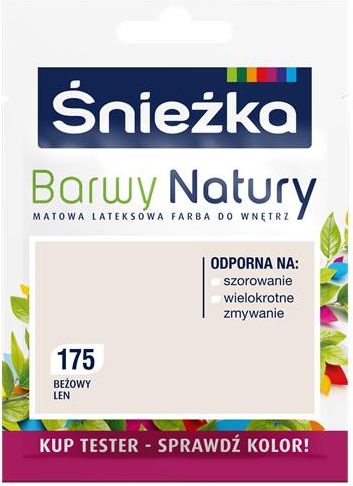 Śnieżka Barwy Natury 175 Beżowy Len Kolor - 175 Beżowy Len | Pojemność - 0,025L | Wydajność - do 14m²/l ZASTOSOWANIE Pokój nastolatka Korytarz Ściana Sufit DOSTĘPNE KOLORY 101 Posrebrzane Żyto 102 Piaszczysta Plaża 103 Złote Kłosy 104 Łany Pszenicy 105 Letni Poranek 107 Angielska …
