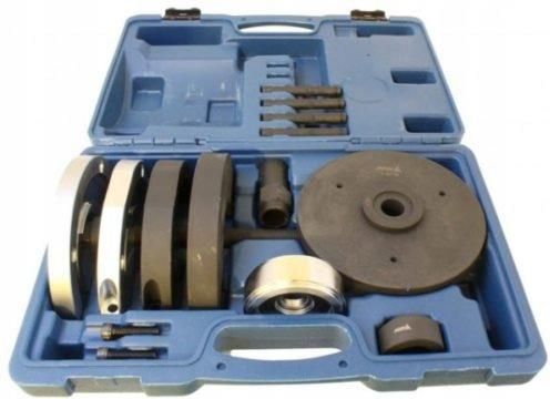 A-H178 ZESTAW DO MONTAŻU I DEMONTAŻU PIAST ORAZ ŁOŻYSK 78 Specjalny zestaw do instalowania i demontowania łożysk – piasty koła o średnicy 78mm. Stosowanie tego zestawu umożliwia zdemontowanie łożyska – piasty pod odpowiednim kątem, co jest bardzo istotne, aby nie dopuścić do uszkodzenia obudowy i innych elementów. Jeżeli pierścień blokujący zostanie uszkodzony, istnieje w takim przypadku duże ryzyko, że łożysko będzie oddzielone od piasty, co spowoduje przedwczesne zużycie tych elementów. Zastosowanie: Ford Focus II od 2004; do Focus C-Max 2003-2007 i C-Max z 2007. Volvo C30 z 2006., 2 C70 Cabriolet z 2006, model S40 i V50 z 2004. MAZDA 3 (BK) 1.4i; 1.6i; 2.0i; 1.6DI Turbo z 2003. Zawartość zestawu : Płyta dociskowa Sworznie dystansowe płyty dociskowej Trzpień gwintowany Nakrętka wrzeciona Pierścień do wyprasowania piasty – łożyska Pierścień centralny do wyprasowania łożyska – piasty Śruby adapterów Adaptery do wyprasowania piasty – łożyska Pierścień dystansowy do wyprasowania łożyska – piasty