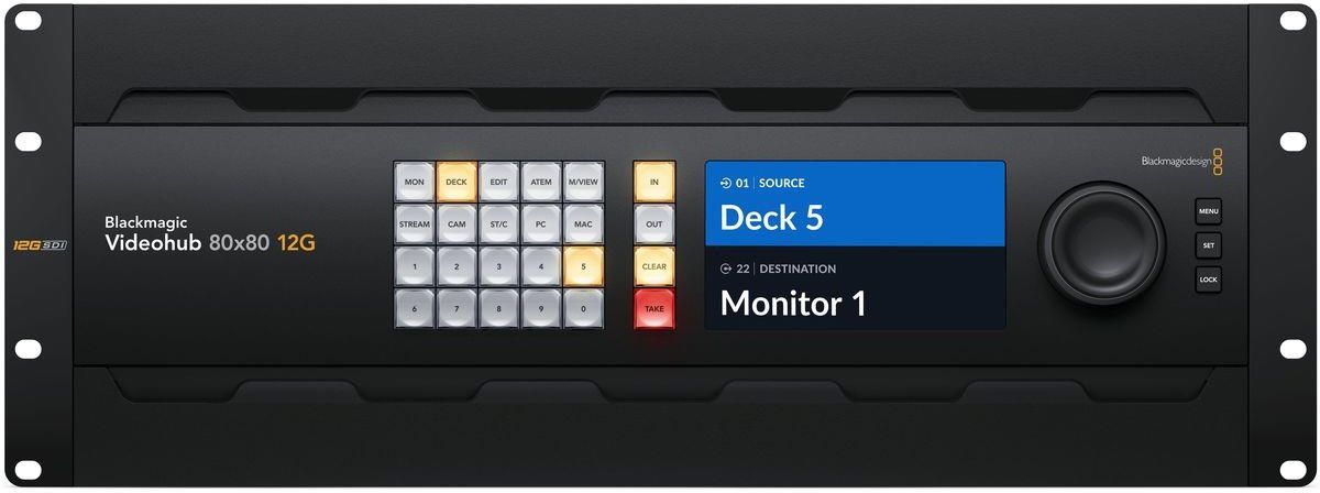 Blackmagic Videohub 80x80 12G to zaawansowany router wideo o zerowej latencji, który jednocześnie obsługuje na routerze dowolną kombinację SD, HD i Ultra HD. 80 wejść 12G-SDI posiada diody LED na każdym BNC, które wskazują sygnał SDI, a także 80 wyjść 12G-SDI, redundantne zasilanie i połączenia referencyjne w stylowej konstrukcji, zajmującej cztery jednostki rackowe. Duży wyświetlacz LCD Full HD pozwala na podgląd wideo przed routowaniem i wyraźnie wyświetla etykiety routingu oraz standardy wideo. Routing można wykonać za pomocą bezpośredniego wyboru przycisku i dużego pokrętła z elektronicznym sprzęgłem. Posiada również przetaktowanie SDI, zewnętrzne sterowanie Ethernet i obsługuje wszystkie standardy wideo SDI do 2160p60.