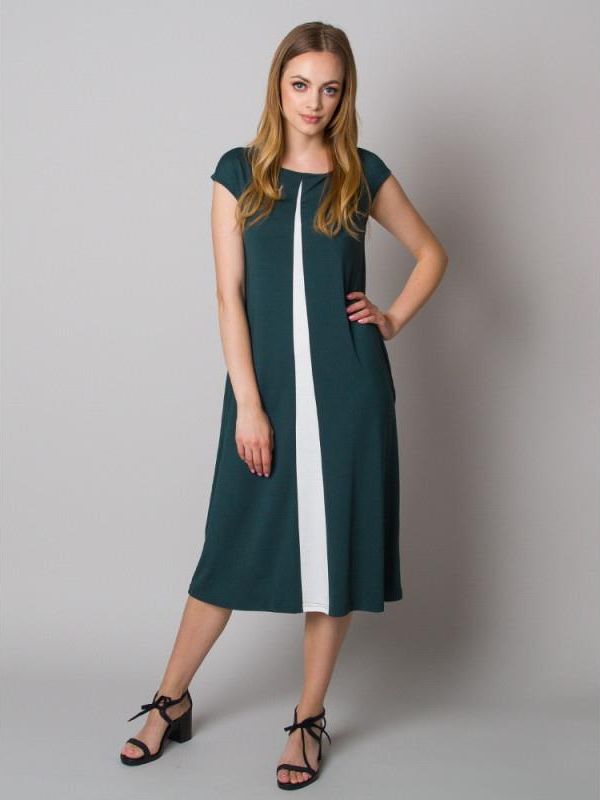 Długa sukienka z kontrastem Długa bawełniana sukienka z krótkim rękawem, okrągłym dekoltem i kontrastem. Sukienka świetnie sprawdzi się na co dzień oraz do biura. Dzięki połączeniu sukienki z odpowiednimi dodatkami możemy stworzyć zarówno stylizację casualową, jak i sportową.Skład materiału sprawia, że sukienka jest przewiewna i delikatna w dotyku. Kolor główny: gładka zielona z białym kontrastem Wykończenia: okrągły dekolt Długość rękawów: krótkie Rodzaj sukienki: długa, zwiewna Skład: 68% rayon, 27% poliester, 6% spandex Wyprodukowano w Polsce Gwarancja: 24 m-ce