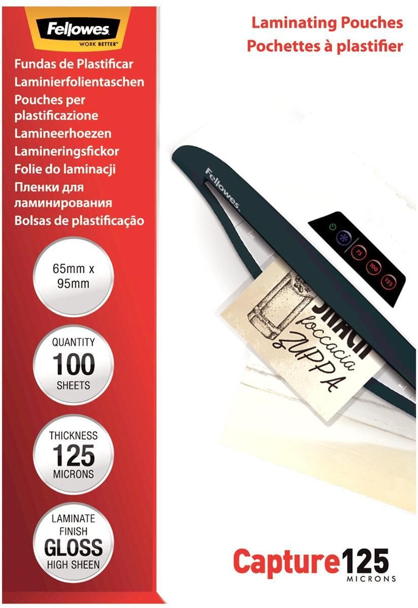 Fellowes | Lamination pouches | 64 x 95 mmTechnical details: Producer product name - Laminating Pouch - 65x95mm Inne funkcje - Ideal for identity cards, credit cards, business cards and visitor cards; Capture 125 Micron thickness - providing an advanced level of document protection; Pack size of 100; Compatible with all laminator brands Producer - Fellowes Design: kolor - Glossy Package features / Gross depth (mm): 70 mm Package features / Gross height (mm): 103 mm Package features / Gross width (mm): 30 mm Package features / Packing quantity: 8 szt. Package features / Plastic (No PET): 10 g Package features / Tare weight (kg): 0.01 kg Package features / Volume (m3): 0.0002163 m³ Package features / Embeeded battery: No Package features / WEEE tax: No Package features / Gross depth master carton: 160 mm Package features / Gross width master carton: 120 mm Package features / Gross height master carton: 160 mm Package features / Net weight master carton: 1.52 kg Package features / Tare weight master carton: 0.031 kg Package features / Palette Qty: 4496 szt. Technical details / Gross weight: 0.19 kg Technical details / Net weight: 0.18 kg Technical details / Producer product name: Laminating Pouch - 65x95mm Technical details / Inne funkcje: Ideal for identity cards, credit cards, business cards and visitor cards; Capture 125 Micron thickness - providing an advanced level of document protection; Pack size of 100; Compatible with all laminator brands Technical details / Producer: Fellowes Design / kolor: Glossy Warranty: 24 miesiąc