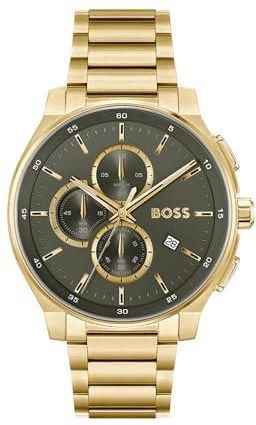 Hugo Boss 1514190 Zegarek Hugo Boss 1514190 to nie tylko narzędzie pomiarowe, ale także eleganckie akcesorium, które podkreśla Twój styl i osobowość. Ten model łączy w sobie klasyczny design z nowoczesnymi rozwiązaniami, co czyni go idealnym wyborem zarówno na codzienne aktywności, jak i na specjalne okazje. Dzięki precyzyjnemu mechanizmowi kwarcowemu, Hugo Boss 1514190 zapewnia niezawodność oraz wysoką dokładność pomiaru czasu. Elegancja i jakość wykonania Zegarek Hugo Boss 1514190 przyciąga wzrok swoją klasyczną formą i eleganckim wykończeniem. Mechanizm kwarcowy, znany ze swojej długowieczności, sprawia, że model ten jest idealny dla osób ceniących sobie jakość oraz funkcjonalność. Okrągła koperta o średnicy 44 mm i grubości 11,2 mm, wykonana ze stali nierdzewnej z pozłacanym wykończeniem, nadaje mu luksusowy wygląd, który doskonale prezentuje się na nadgarstku. Funkcjonalność i design Tarczę zegarka zdobi oliwkowo-zielony kolor, który harmonijnie łączy się z pozłacaną obudową. Dwuwarstwowa, super matowa tarcza gwarantuje doskonałą widoczność wskazówek i indeksów. Dodatkowe tarcze podrzędne zwiększają funkcjonalność oraz nowoczesny charakter tego modelu. Warto zwrócić uwagę na kluczowe cechy, które wyróżniają ten zegarek: mechanizm kwarcowy zapewniający wysoką precyzję, wodoszczelność na poziomie 50 m, co pozwala na korzystanie z zegarka podczas kąpieli lub pływania, luksusowa pozłacana bransoleta ze stali nierdzewnej, zintegrowana dla bezszwowego wyglądu, okrągła koperta o średnicy 44 mm, idealna na nadgarstek, elegancki i nowoczesny design, pasujący zarówno do stylizacji casualowych, jak i eleganckich, dwuwarstwowa tarcza w oliwkowo-zielonym kolorze, z nakładającymi się tarczami podrzędnymi, analogowy mechanizm, który zapewnia intuicyjne odczytywanie czasu. Komfort noszenia Zegarek Hugo Boss 1514190 wyposażony jest w pozłacaną bransoletę ze stali nierdzewnej, zaprojektowaną z myślą o komforcie noszenia oraz estetyce. Zintegrowana konstrukcja bransolety sprawia, że zegarek wygląda elegancko, a jego szerokość jest optymalna, co zapewnia wygodę użytkowania przez dłuższy czas. Luksusowy wygląd bransolety sprawia, że jest to idealny dodatek do różnych stylizacji. Wodoszczelność i praktyczność Hugo Boss 1514190 charakteryzuje się wodoszczelnością 50 m, co czyni go praktycznym wyborem dla osób, które aktywnie spędzają czas, nie rezygnując z eleganckiego wyglądu. Zegarek można nosić podczas kąpieli czy pływania, jednak nie zaleca się jego używania podczas nurkowania, co jest istotne dla osób, które często przebywają w wodzie.