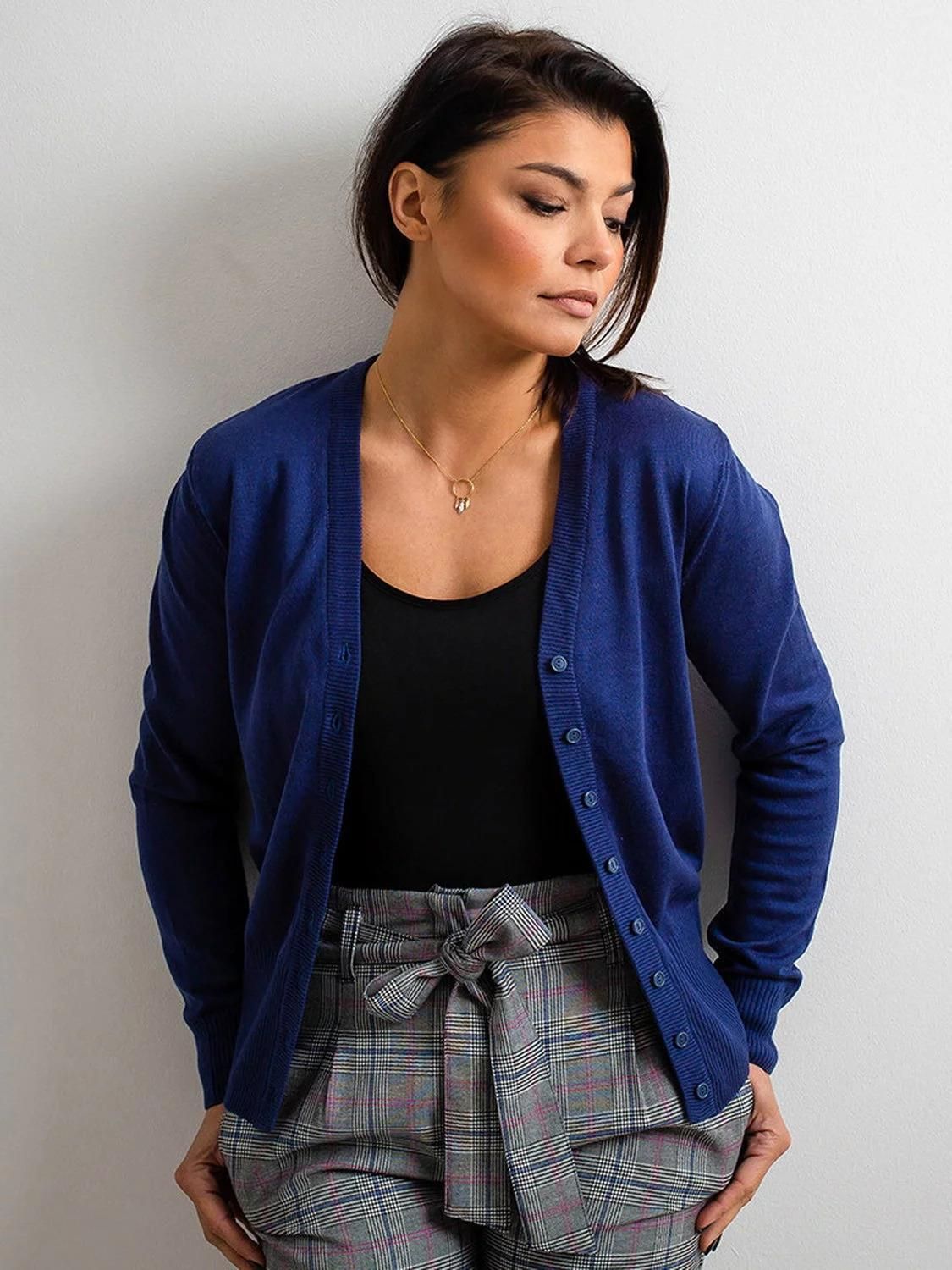 Klasyczny kardigan damski Zapinany sweter damski typu kardigan. Doskonały zarówno na ciepłe jak i chłodne dni. Dobrze komponuje się z koszulami damskimi Willsoor. Typ: kardigan Kolor: granatowy, gładki Skład: 50% bawełna, 50% akryl Jakość: pierwsza Producent: Willsoor Gwarancja: 24 m-ce Uszyty w Polsce