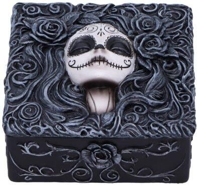 Kompaktowe pudełko na drobiazgi o wymiarach 6,3 cm, inspirowane Dniem Zmarłych, z gotyckim akcentem, idealne do przechowywania drobnych pamiątek i skarbów. Pudełko posiada zdejmowaną pokrywkę z pięknie wyrzeźbioną twarzą dziewczyny z Dnia Zmarłych w czarno-białej palecie barw, otoczoną szczegółowymi motywami kwiatowymi.