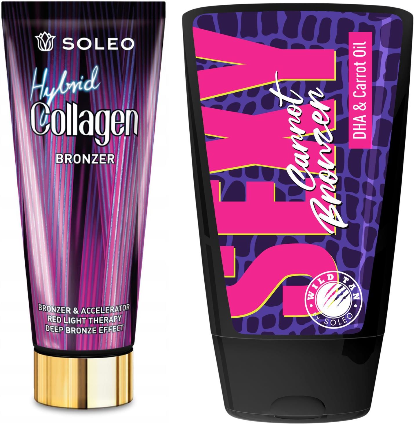 Soleo Hybrid Collagen + Wild Tan Sexy Carrot GratisSoleo Hybrid Collagen Bronzer Hybryda Z KolagenemHybrid collagen bronzer to innowacyjne połączenie bronzera i przyspieszacza z kolagenem.Zapewnia intensywny efekt opalania i głębokie nawilżenie skóry.Formuła HYBRID stymuluje biosyntezę melaniny i przyspiesza proces brązowienia skóry.Balsam szybko się wchłania i otula ciało pięknym egzotycznym zapachem.Zapach: secret passion fruitPojemność: 200 mlSposób użycia: Nanieś równomierną warstwę przyspieszacza na całą powierzchnię ciała przed sesją w solarium lub słońcuWild Tan Sexy Carrot Bronzer Z Olejem Z Karotki 125mlBronzer z olejem z karotki wzmacniającym opaleniznę. Kombinacja oleju ze słodkich migdałów i masła shea zapewnia mocne nawilżenie oraz skórę gładką i miękką w dotyku.Zapach: Banana blossomPojemność: 125ml