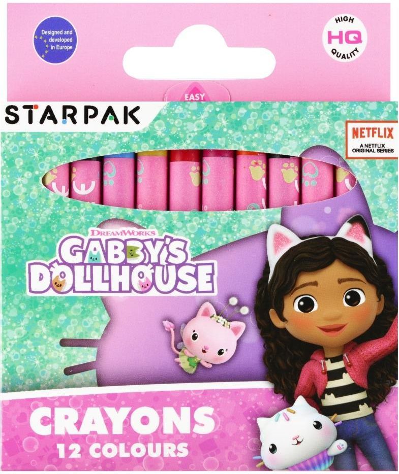KREDKI WOSKOWE 12 KOL. Zestaw 12 kredek woskowych STARPAK w żywych barwach idealnych dla najmłodszych artystów, którzy dopiero zaczynają malować. Nie łamią się podczas rysowania. Dobrze kryją malowaną powierzchnię. Zapakowane w kartonowe pudełko z grafiką i z motywem ulubionej postaci Gabby's …