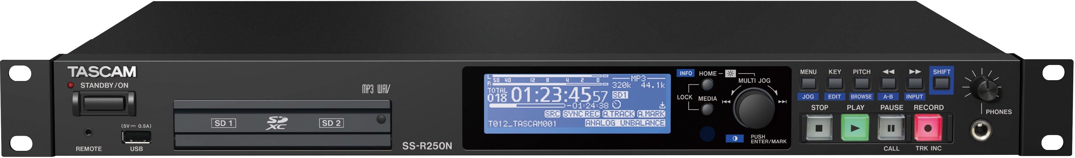 Cechy ogólne Nagrywanie i odtwarzanie z nośników USB (do 64 GB), kart SD/SDHC/SDXC (do 128 GB) Obsługuje nagrywanie i odtwarzanie plików o wysokiej rozdzielczości, do 96 kHz / 24 Bit Możliwa obsługa przez sieć Funkcja klienta FTP umożliwia automatyczne przesyłanie nagranych plików lub pobieranie plików audio z serwera Dzięki listom zdarzeń do nagrywania, odtwarzania, pobierania i innych funkcji, urządzenie może być obsługiwane automatycznie na podstawie ustawionego czasu Synchronizacja czasu za pośrednictwem klienta SNTP umożliwia zarządzanie zdarzeniami z wysoką dokładnością Aplikacja sterująca iOS / Android umożliwia operacje transportu i zdalne sterowanie różnymi ustawieniami Opcjonalna karta interfejsu IF-DA2 obsługuje dwa kanały wejść i wyjść Dante Porty szeregowe i równoległe Kontroler szybkiego startu, RC-SS150, z kolorowym ekranem LCD, dostępny jako opcja Możliwość podłączenia przełącznika nożnego Tascam RC-3F lub pilota zdalnego sterowania RC-20 Możliwości nagrywania Podwójne gniazdo pamięci SD pozwala na nagrywanie równoczesne lub nagrywanie po kolei Znaczniki mogą być ustawiane automatycznie, gdy pojawi się błąd lub przesterowanie wejścia Funkcja nagrywania wstępnego zapobiega brakom początkowych fragmentów nagrań Funkcja automatycznego śledzenia automatycznie przycina materiał audio do ścieżek Kompresor i limiter pomagają podwyższyć jakość nagrania Dostępna funkcja automatycznej kontroli głośności do automatycznej regulacji poziomu wejściowego przy nagrywaniu Nagranie może się zacząć od razu po włączeniu urządzenia (Funkcja Power-on recording) Bezpośrednie rejestrowanie pozwala na rozpoczęcie nagrania bez uprzedniego przełączania w tryb gotowości Złącza wejściowe XLR dla mikrofonów, wyposażone w zasilanie phantom (mogą być również użyte ze źródłami liniowymi) Złącza wejściowe RCA dla urządzeń źródłowych o poziomie konsumenckim Wejście cyfrowe AES/EBU (XLR) Wejście koncentryczne SPDIF (RCA) Funkcje odtwarzania Funkcja przywoływania zapisuje pozycję w której zaczęło się ostatnie odtwarzanie Funkcja tłumienia automatycznie zmniejsza poziom odtwarzania, podczas gdy poziom wejściowy wzrasta i odwrotnie Odtwarzanie przyrostowe (Incremental play) – przeskakuje do kolejnej ścieżki po naciśnięciu przycisku PLAY Funkcja Auto Cue lokalizuje pierwszy dźwięk w ścieżce gdy urządzenie jest w trybie gotowości do odtwarzania Funkcja Auto Ready pozwala na wstrzymanie odtwarzania zanim rozpocznie się kolejna ścieżka Funkcje kontroli wysokości dźwięku i tonacji Dostępne tryby odtwarzania Program, Random i Single Funkcja powtarzania (wszystkie ścieżki, sekcja A-B) Funkcja odtwarzania miksu monofonicznego Znaczniki mogą być ustawione w dowolnej pozycji EOM (Koniec wiadomości) może powiadomić użytkownika przed zakończeniem ścieżki Inne funkcje Konwerter częstotliwości próbkowania dla wejść i wyjść Funkcja łączenia odtwarzania umożliwia równoległe działanie dwóch urządzeń Automatyczne zamykanie pliku zapobiega utracie danych przy nagłej awarii zasilania podczas rejestracji Ustawienia użytkownika: Do 3 zestawów ustawień można zapisać aby móc szybko zmieniać wejścia, wyjścia, częstotliwości próbkowania i inne funkcje Możliwość zamontowania w racku 1U Nowe funkcje w oprogramowaniu v1.30 Komendy RS-232C i Telnet mogą teraz być użyte również do włączenia i wyłączenia zasilania urządzenia oraz zmiany ustawień funkcji TIME SKIP (zobacz szczegóły dla Właściwości protokołu RS-232C/Telnet v1.15) SS250 Control (v2.0.0) jest wymagany dla tego oprogramowania Nowe funkcje w oprogramowaniu v1.20 Pliki i foldery mogą mieć zmieniane i edytowane nazwy przy użyciu RS-232C i Telnet Nowe funkcje w oprogramowaniu v1.10 Automatyczny podział ścieżek jest możliwy w odstępach czasowych (1–10 minut, 15/30 minut, 1 godzina, 2/6/8/12/24 godziny) SS250 Control (v1.1.0) jest wymagany dla tego oprogramowania Nowe funkcje w oprogramowaniu v1.01 SS250 Control (aplikacja zdalnego sterowania) jest teraz obsługiwana Pilot zdalnego sterowania RC-900 jest teraz obsługiwany