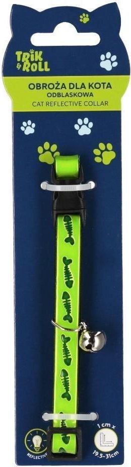 Trik&Roll Obroża Dla Kota Odblaskowa z Dzwonkiem 1cm 560697 Obroża z dzwoneczkiem dla kota może być praktycznym dodatkiem, ułatwiającym lokalizację czworonoga oraz ostrzegającym potencjalne ofiary podczas polowań. Obroża posiada regulację szerokości dzięki czemu bez problemu można ją dopasować do obwodu szyi kota. Dzwoneczek można odczepić. Obroża wykonana z delikatnych dla pupila materiałów. Obroża w odblaskowym zielonym kolorze z nadrukowaną grafiką ryby. wymiary produktu dł. x szer. cm od 19,5 do 31x1, waga produktu kg 0,02 kg.