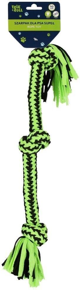 Trik&Roll Zabawka Dla Psa Szarpak Supeł 50cm 560878 Ten szarpak jest wyjątkowo mocny i trwały, co sprawia, że może posłużyć przez długi czas nawet przy intensywnej zabawie. Jest to idealna zabawka dla psów, które lubią przeciąganie i gryzienie, a jednocześnie potrzebują bezpiecznego i miękkiego materiału dla zębów. Zabawka idealna do przeciągania, aportowania oraz jako gryzak. Szarpak nie posiada piszczałki oraz jakichkolwiek zapachów, możliwość prania w 30 stopniach C. Zabawka wykonana jest z ciasno plecionego sznurka z supłami, 100 % bawełna. Szarpak w kolorze czarno-zielonym. wymiary produktu (dł.)[cm]: 50 cm, waga produktu [kg]: 0,18 kg