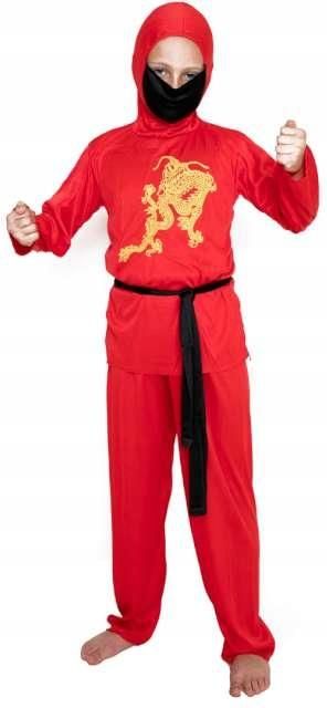 Przebranie dla chłopca - ninja. Strój w kolorze czerwonym. W skład zesrtawu wchodzi koszulka z długimi rękawami, spodnie, kaptur, maska oraz pasek. Na koszulce znajduje się nadruk w kształcie smoka. Strój na bal przebierańców, zabawy karnawałowe w szkole i przedszkolu, zabawę tematyczną. Strój w rozmiarze L na wzrost 130 cm - 140 cm." Producent/osoba odpowiedzialna za bezpieczeństwo produktuArpexM. Płażyńskiego 4244-100 Gliwiceinfo@arpex.com.pl+48 32 232 49 07Ostrzeżenie. Trzymać z dala od ognia. Przed podaniem dzieciom do zabawy usunąć opakowanie.