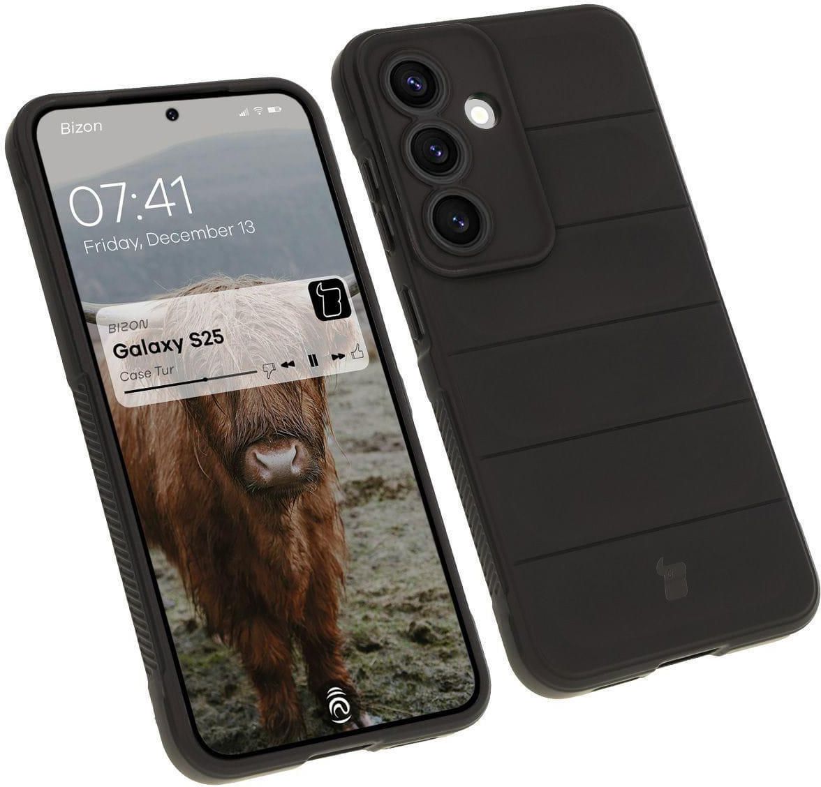 Bizon Case Tur Do Samsung Galaxy S25 Wersja kolorystyczna: Black (czarna) Materiał: TPU Pancerny design Ochrona przed zarysowaniami i zabrudzeniami + amortyzacja w razie upadku Wzmocnione narożniki Podwyższone krawędzie Wyściółka z mikrofibry Łatwy montaż i demontaż Dedykowane wycięcia na obiektywy Zintegrowane osłony na przyciski Kompatybilność z ładowaniem indukcyjnym W środku etui mogą znajdować się przebarwienia. Nie wpływają one na wygląd zewnętrzny obudowy. Przedmiotem sprzedaży jest samo etui, pozostałe akcesoria widoczne na zdjęciach służą jedynie przedstawieniu jego funkcjonalności. Kod produktu: 5904665323540 Kod producenta: BCTGALS25BK Etui kompatybilne ze szkłami* o wymiarach mniejszych niż (dług./szer.): 14,50 x 6,84 cm * Bolączki z dobraniem pasującego szkła? Wybierz Bizon Glass Clear ❤️! Pancerna ochrona Etui marki Bizon z serii Tur to inspirowana naturą, elastyczna obudowa, która świetnie sprawdzi się w codziennym użytkowaniu i zapewni Twojemu smartfonowi wysoką ochronę przed zarysowaniami, zabrudzeniami oraz w razie upadku! Etui wyróżnia subtelne logo w kształcie głowy bizona. Mocna konstrukcja Pokrowiec został wykonany z giętkiego, termoplastycznego poliuretanu, dzięki czemu montaż i demontaż nie sprawi Ci większych problemów. Etui cechuje niewielka grubość wynosząca zaledwie 2 mm, a jego dodatkowym atutem jest ukryta w środku warstwa z mikrofibry, która dodatkowo ochroni telefon w razie upadku. Wyżłobienia na pleckach nie tylko ładnie wyglądają, ale zachowują się także jak niewidzialne poduszki powietrzne i amortyzują w razie wstrząsów czy upadku! Aby zapewnić Twojemu telefonowi najlepszą ochronę, takie samo rozwiązanie zastosowano również w rogach obudowy. Pewny chwyt Miałeś kiedyś do czynienia z etui, które dosłownie samo wypadało z rąk? Z Turem to zupełnie inna bajka! Obudowa telefonu została zaprojektowana z myślą o lepszym chwycie. Teksturowane boki pozwolą Ci na pewniejszy i stabilniejszy chwyt urządzenia, a gdyby i tak zdarzyło Ci się je niefortunnie upuścić ekranem do dołu, to podwyższone krawędzie wokół niego nie pozwolą, aby bezpośrednio zderzyło się z podłogą! Uniesione brzegi znajdują się także wokół wyspy aparatu, co w połączeniu z dedykowanymi wycięciami na obiektywy tworzy podwójną ochronę dla aparatu. Swobodny dostęp Tur to nie tylko solidna konstrukcja, ale także gwarancja płynnego działania przycisków, które będą dodatkowo chronione dzięki zintegrowanym osłonom! Oprócz idealnego dopasowania do kształtu telefonu etui posiada także wszelkie niezbędne wycięcia i zapewnia pełen dostęp do portów. A jeśli wolisz ładować bezprzewodowo, to możesz to robić bez ściągania obudowy, ponieważ pokrowiec doskonale współgra z ładowaniem indukcyjnym (dotyczy modeli wyposażonych w tę funkcję).