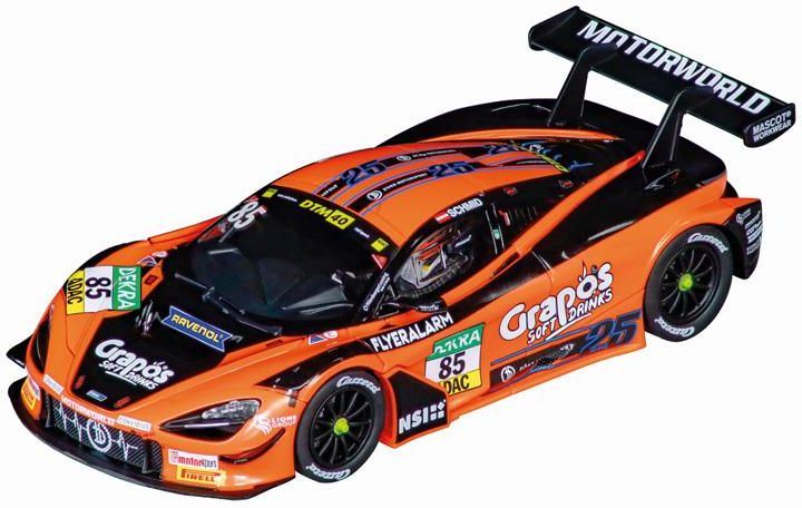 Samochody wyścigowe CARRERA DIGITAL 132Samochody serii DIGITAL 132 wykonane zostały w skali 1:32. Posiadają niesamowite osiągi: rzeczywiste przyspieszenia i hamowania. Większość wyposażona jest w działające przednie i tylne światła. Seria DIGITAL 132 to samochody cyfrowo kontrolowane i indywidualnie kodowane, co umożliwia jednoczesne poruszanie się aż 6 aut na jednym torze jazdy (w jednym rowku). Wysokiej klasy, oryginalne wyścigówki zostały wyprodukowane w technice tampodruku z ogromną dbałością o szczegóły. Wszystkie samochody tej serii przemieszczają się na specjalnie skonstruowanych prowadnicach, mocowanych do zawieszenia. Samochód McLaren 720S GT3 "Dörr Motorsport, nr 85" DTM 2024 wyposażony został w przednie oświetlenie ksenonowe i światła tylne.