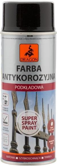 DRAGON Farba antykorozyjna podkładowa SUPER SPRAY 500 ml czarny EAN: 5903649018939 DRAGON Lakier Antykorozyjny Auto Podkład w Aerozolu to niezawodny preparat, który zapewnia skuteczną ochronę stali i żeliwa przed korozją, jednocześnie stanowiąc idealną bazę dla farb nawierzchniowych. Dzięki doskonałemu kryciu i zdolności do redukcji przebarwień, podkład pomaga uzyskać jednolitą i estetyczną powłokę. Produkt tworzy matową warstwę, która nie tylko poprawia wygląd zabezpieczanych powierzchni, ale także wygładza nierówności, co umożliwia uzyskanie idealnej gładkości przed dalszymi pracami lakierniczymi. Lakier charakteryzuje się wysoką odpornością na czynniki atmosferyczne i promieniowanie UV, co czyni go doskonałym rozwiązaniem zarówno do napraw, jak i konserwacji elementów pojazdów oraz maszyn. Można go stosować zarówno wewnątrz, jak i na zewnątrz, zapewniając wszechstronność i trwałość wykończenia. Wybierz DRAGON Lakier Antykorozyjny Auto Podkład w Aerozolu, aby skutecznie chronić swoje powierzchnie metalowe, uzyskując trwały, profesjonalny i estetyczny efekt! Zalety farby antykorozyjnej Super Spray marki Dragon Przeznaczony do stosowania wewnątrz i na zewnątrz Doskonałe krycie, redukcja przebarwień Matowa powłoka zapewniająca estetyczne wykończenie Gwarantuje doskonałą przyczepność farb nawierzchniowych Wygładza nierówności powierzchni Zapewnia trwałą antykorozyjną ochronę stali i żeliwa Sposób użycia farby antykorozyjnej Super Spray marki Dragon Przed przystąpieniem do malowania należy odtłuścić i osuszyć malowane powierzchnie. Prace prowadzić w temperaturze od +18 ºC do +25 ºC. Bezpośrednio przed użyciem energicznie potrząsać pojemnikiem przez 1 min., tak aby miksująca wewnątrz farby kulka ujednoliciła kolor. Nakładając farbę, pojemnik trzymać w odległości ok. 30 cm od malowanej powierzchni. Przycisk aerozolu należy nacisnąć zdecydowanie i wykonywać jednostajne, miarowe ruchy podczas malowania. Najlepszy efekt daje nałożenie dwóch lub trzech cienkich warstw „na krzyż” w odstępach kilku/kilkunastu minut. Wyczyścić przycisk po użyciu, przekręcając pojemnik do góry dnem i naciskając przycisk aerozolu przez dwie sekundy. Czas schnięcia pojedynczej powłoki ok. 10 min. Całkowity czas wyschnięcia zależy od sumarycznej grubości powłoki i aktualnych warunków podczas nanoszenia farby. W celu uzyskania lepszego efektu dekoracyjnego użyć „Emalię uniwersalną” DRAGON .