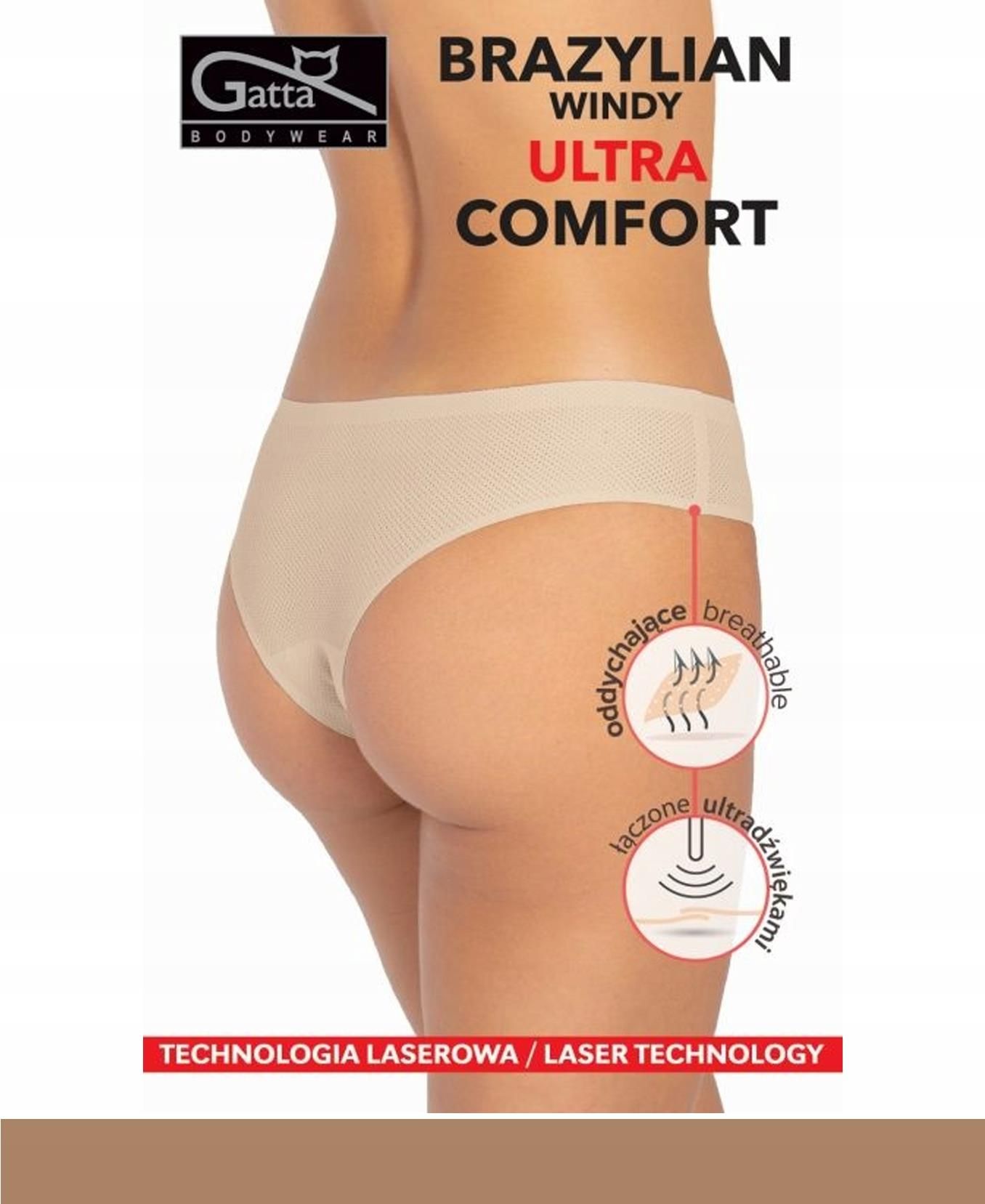 GATTA Brazylian Windy Ultra Comfort k.:Beige r.:L Figi damskie typu brazyliany wykonane z bardzo delikatnej mikrofibry. Cięte laserowo, płasko wykończone, bezuciskowe, nie odznaczają się pod ubraniem. Boki łączone ultradźwiękami. Dają poczucie lekkości i komfortu. Skład: 85% poliamid, 13% elastan, …