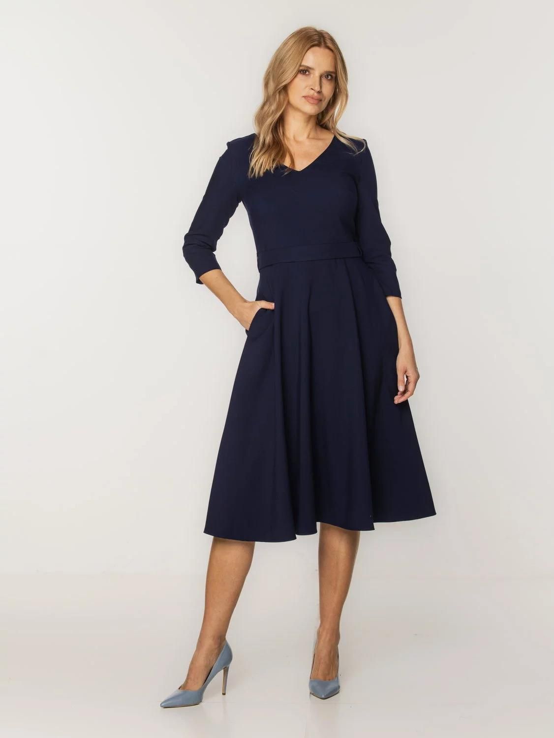 Rozkloszowana sukienka MIDI Elegancka sukienka MIDI z rozkloszowanym dołem i dekoltem w serek (typu V). Sukienka posiada rękaw 3/4 i jest zapinana na plecach za pomocą zamka błyskawicznego. Charakterystycznymi cechami tego modelu są dwie kieszenie oraz pasek, który można wiązać na wiele sposobów. Sukienka świetnie kamufluje niedoskonałości figury, a dzięki paskowi w talii tworzy piękną, klepsydrową sylwetkę. Kolor główny: granatowa o gładkiej fakturze Długość rękawów: 3/4 Rodzaj sukienki: rozkloszowana, długość MIDI, dekolt w serek (typu V) Skład tkaniny wierzchniej: 37% wiskoza, 59% poliester, 4% elastan Skład podszewki: 94% poliester, 6% elastan Wyprodukowano w Polsce Gwarancja: 24 m-ce