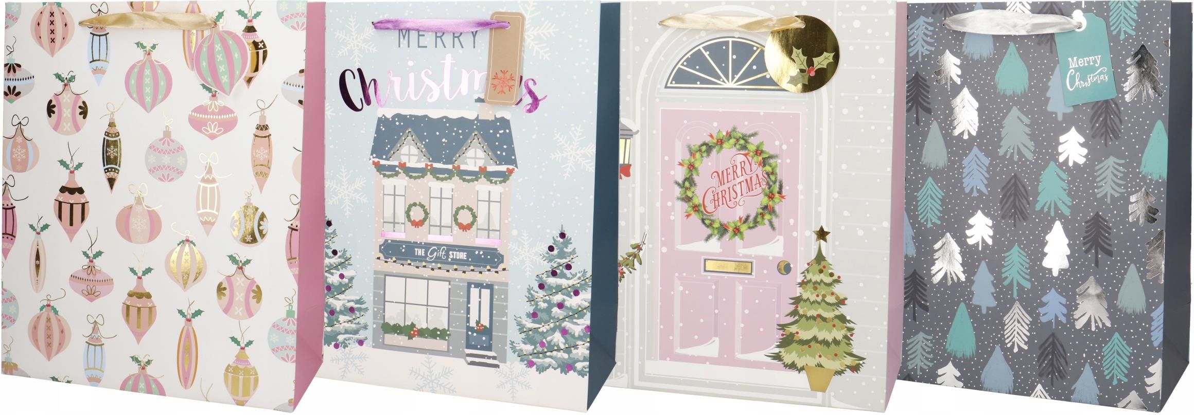 Torba prezentowa - 12 sztuk zestaw eleganckich toreb prezentowych wykonane z wysokiej jakość papieru o gramaturze 210gsm w satynowym matowym wykończeniu efektowne zdobienie hot-stampingiem satynowa rączka piękny graficzny nadruk bardzo eleganckie zestaw 12 sztuk ( po 3 szt. z każdego wzoru ) wymiar 26x32x12cm