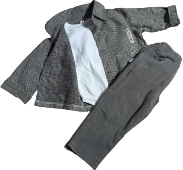Elegancki komplecik chłopięcy idealny na każdą okazję. Białe body z długim rękawkiem wykonane z bawełny. Miękkie, oddychające i komfortowe w noszeniu. Zapinane w kroku na napki. Marynarka w piękną kratę, w stylu retro. Z kołnierzykiem, zapinana na guziczki, z małą kieszonką na lewej piersi i naszywką z napisem "WOODLAND". Mankiety zapinane na guziczki. Wewnątrz marynarki bawełniany puszek, który sprawia, że mimo swej lekkości jest ona ciepła. Spodenki uszyte z najwyższej jakości bawełny (98%) z domieszką włókien elastycznych (2% elastan) dla idealnego dopasowania do ciała dziecka. W pasie ściągacz, który zapobiega zsuwaniu się spodenek z pupki dziecka. Spodnie posiadają dwie kieszonki i imitację rozporka. Wymiary: Body: - długość całkowita: 38 cm - obwód klatki piersiowej: 52 cm Marynarka: - długość całkowita: 33 cm - obwód klatki piersiowej: 58 cm Spodenki: - długość całkowita: 45 cm - obwód w pasie: od 40 do 52 cm